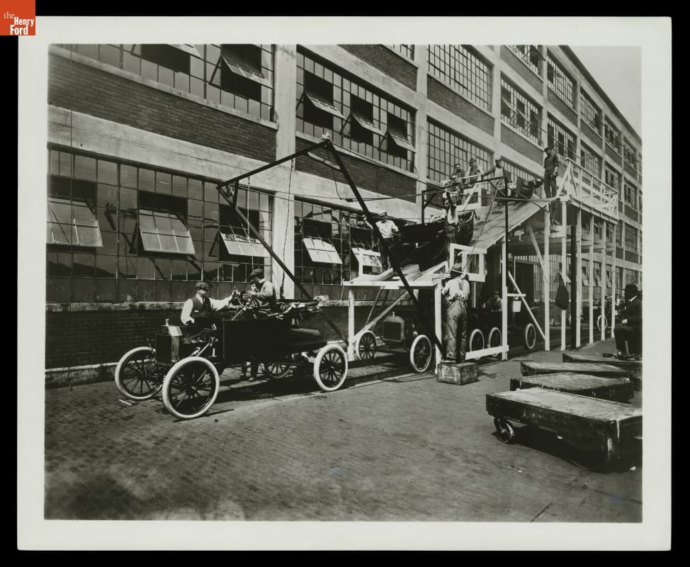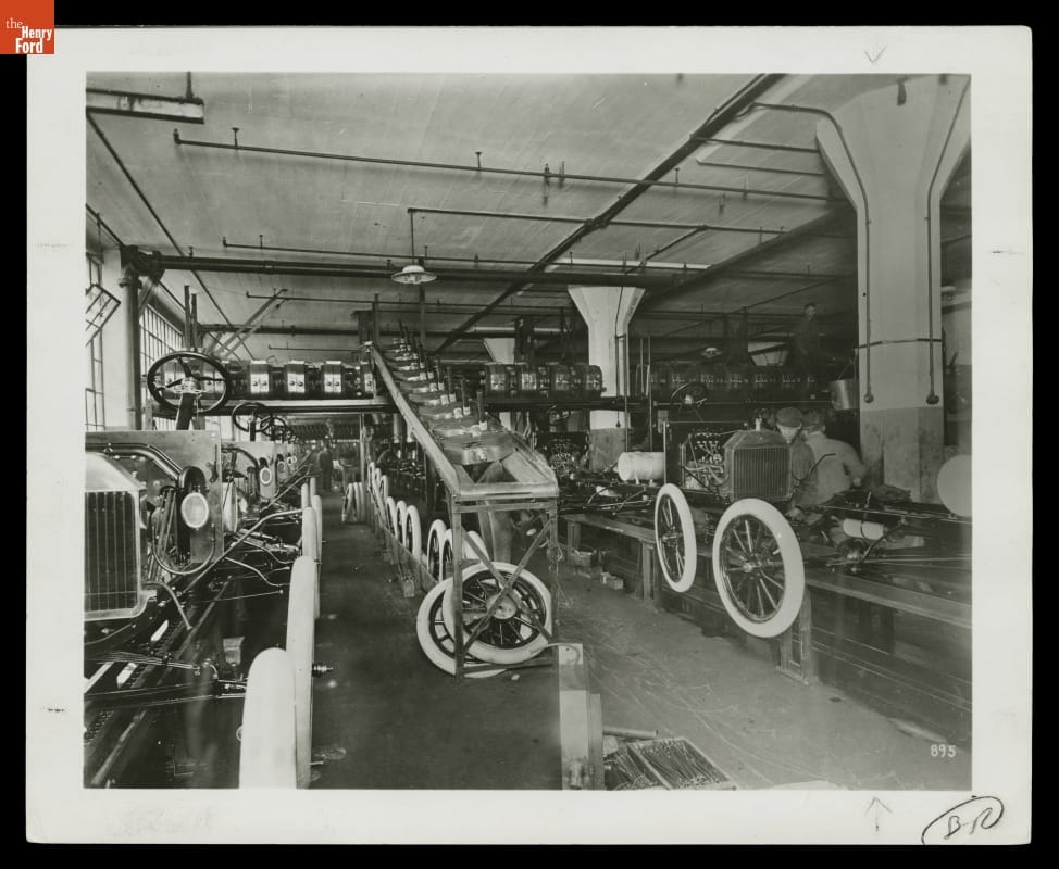 아래 그림은 1914년 포드의 하이랜드 파크 공장 섀시 조립 라인 끝 부분을 찍은 사진이다. 경사면을 통해 내려온 라디에이터를 조립 라인에서 조립하고 있다.