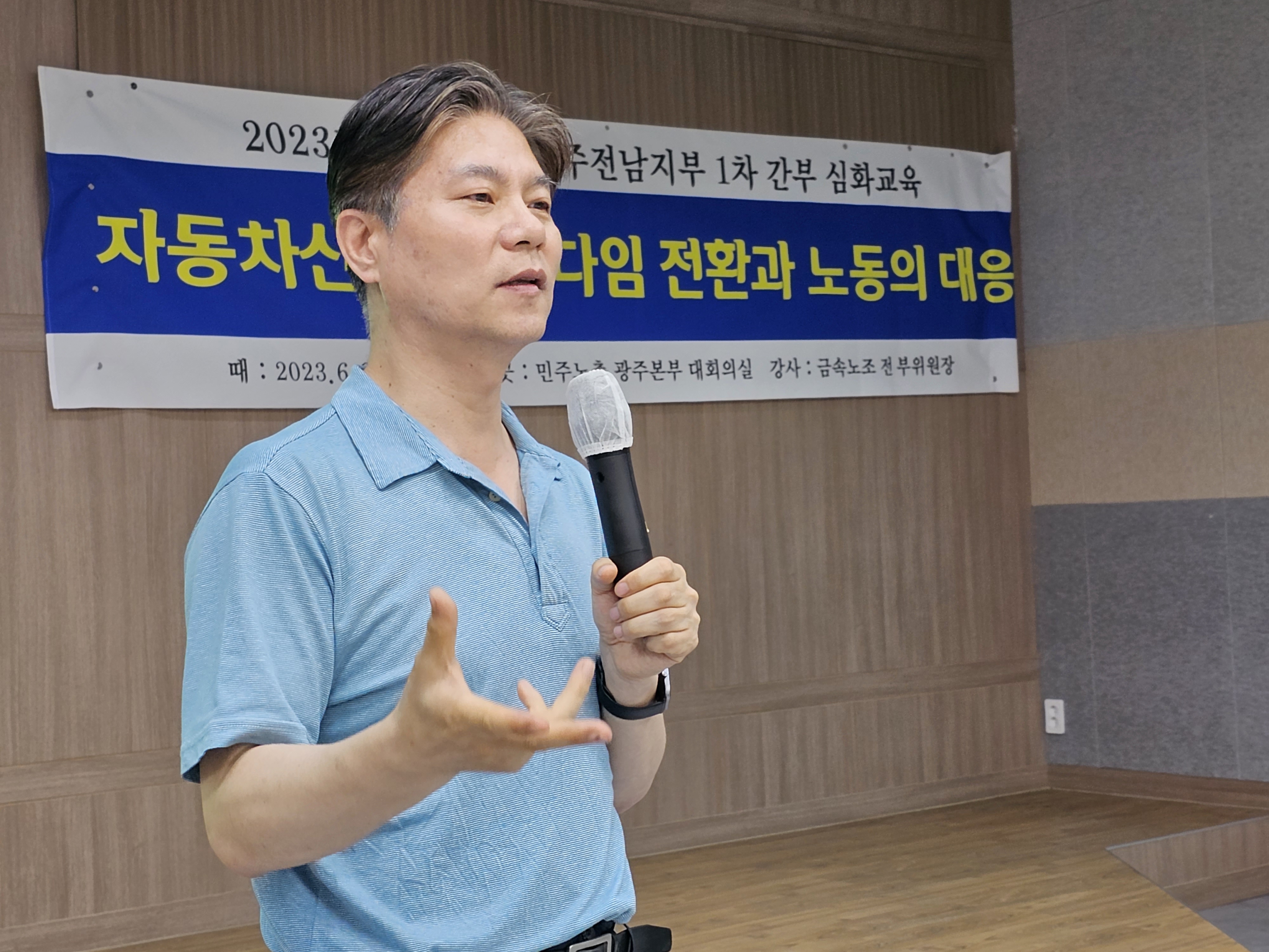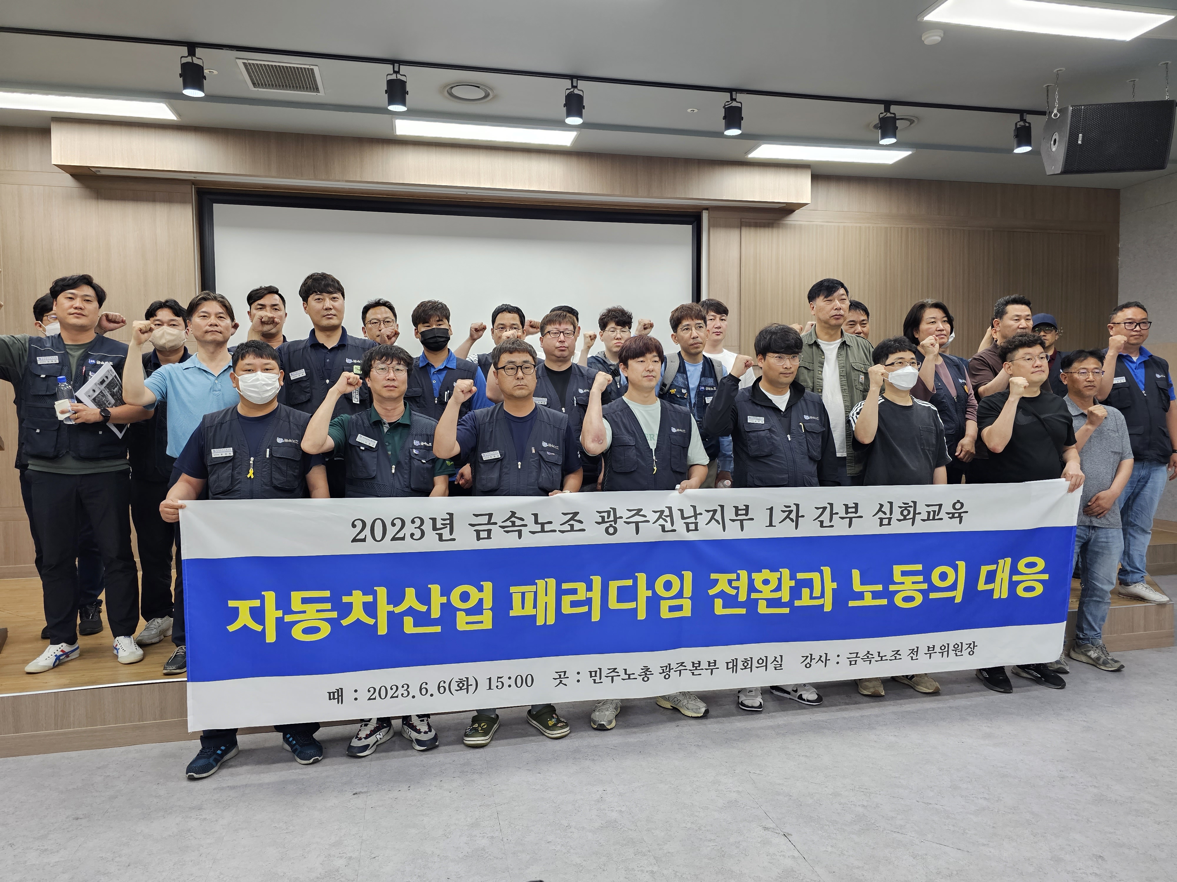 지난 6/6(화) 금속노조 광주전남지부 간부 심화교육을 하였습니다. 오랜만에 만난 동지들도 있고, 처음 뵙는 동지들도 있어서 기쁜 자리였습니다. 지역지부인 광주전남지부가 주최한 간부교육이었지만, 기업지부 소속인 기아자동차지부 광주지회 간부들도 참석해서 더 의미 있는 자리였습니다.