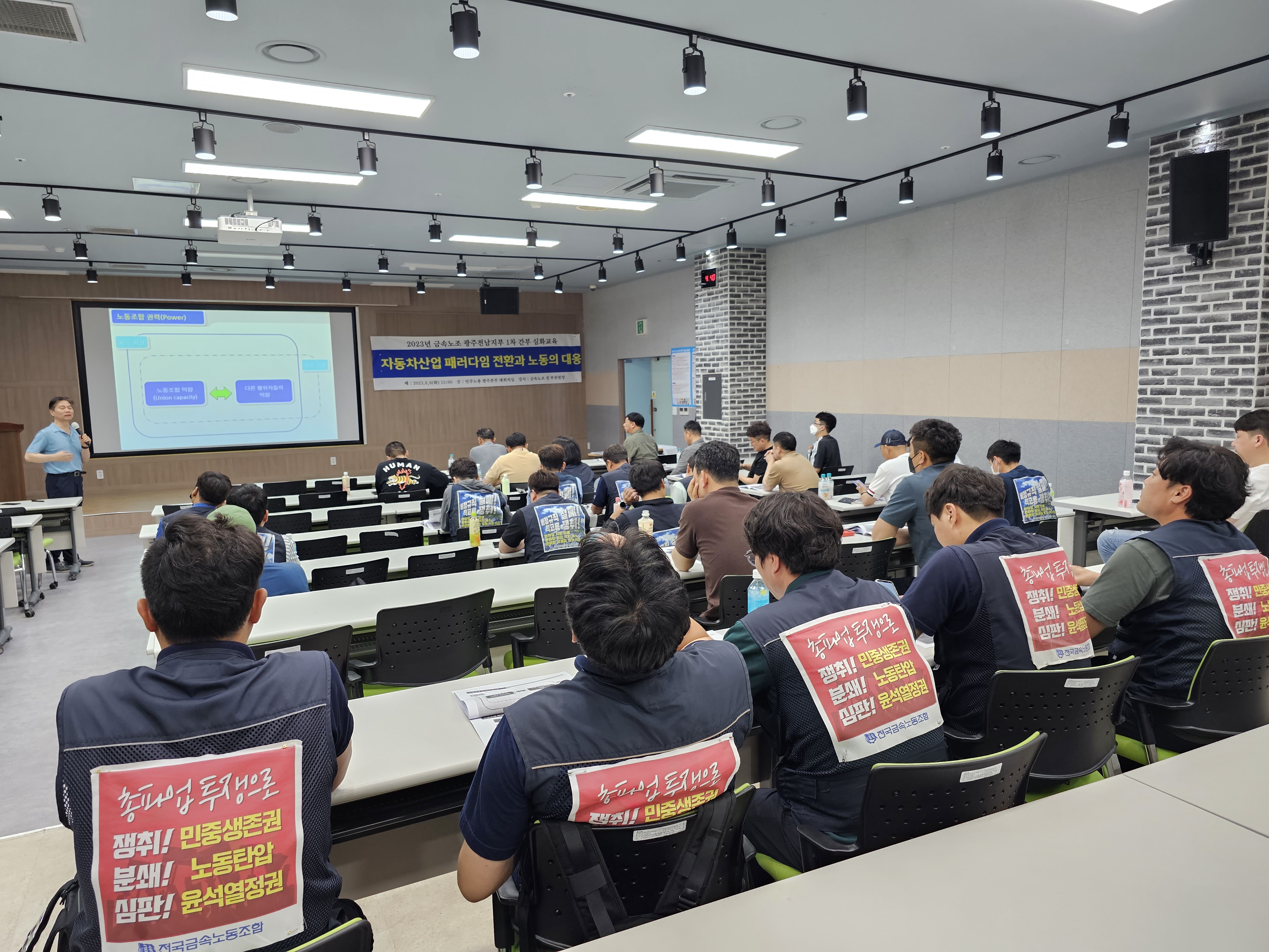 지난 6/6(화) 금속노조 광주전남지부 간부 심화교육을 하였습니다. 오랜만에 만난 동지들도 있고, 처음 뵙는 동지들도 있어서 기쁜 자리였습니다. 지역지부인 광주전남지부가 주최한 간부교육이었지만, 기업지부 소속인 기아자동차지부 광주지회 간부들도 참석해서 더 의미 있는 자리였습니다.