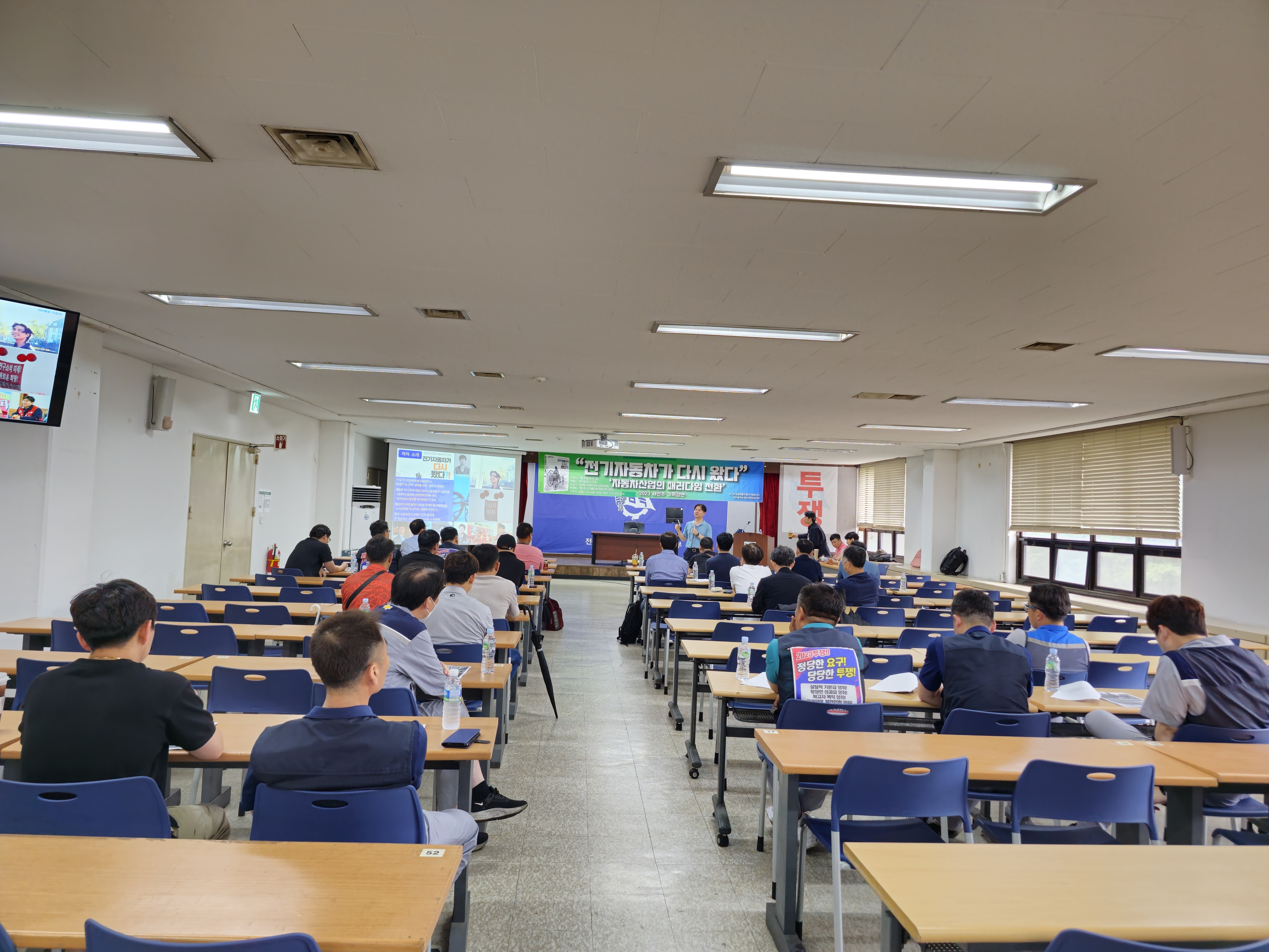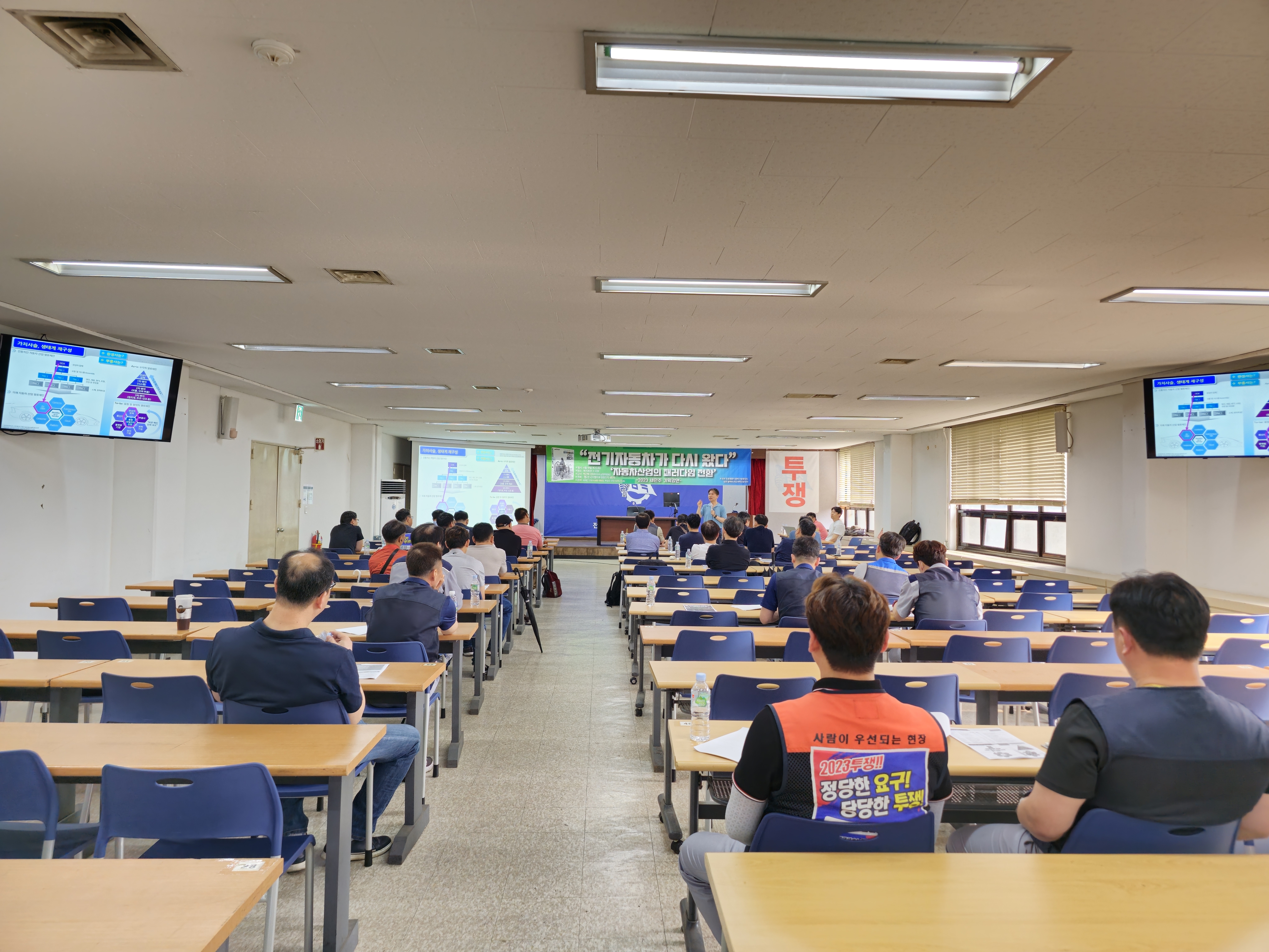 교육장에서도 민기 전 지부장님을 비롯해 옛 동지들을 만나고, 젊은 동지들을 만났습니다. 옛 추억과 새로운 희망이 공존합니다. 열심히 기획하고 준비해 주신 분들, 특근이 진행 중인 휴일인데도 참석해 주신 분들 모두 감사했습니다. 자동차산업 전환 관련해 현장조직이 주최한 강연은 처음인데, 주최 측만이 아니라 다양한 분들이 참석해주셨습니다.