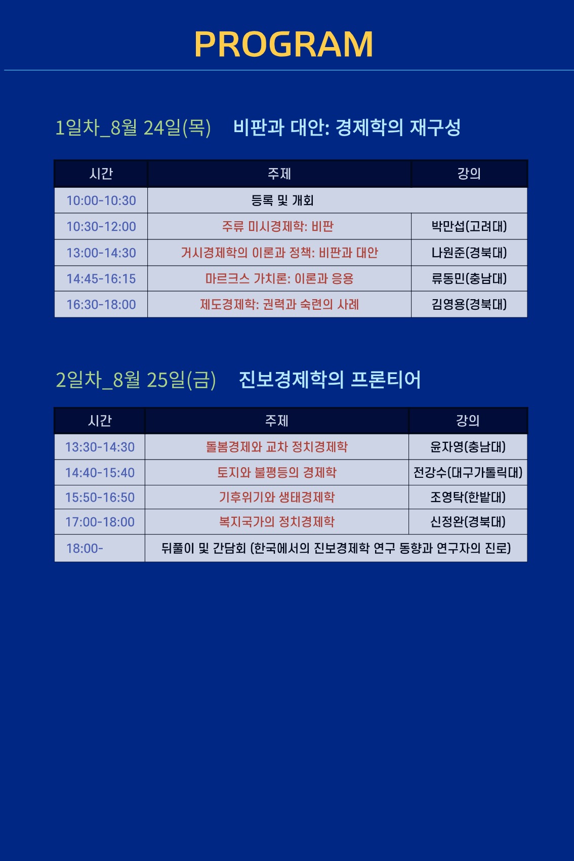 8/25(금) 둘째 날은 “진보경제학의 프론티어”라는 제목대로 현재 부각되고 있는 주요 분야에 대해 다루었습니다.