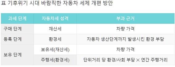 바람직한 자동차 세제 개편 방안은 다음과 같다. 구매세는 현행처럼 자동차 가격을 과세 표준으로 하되, 취득세에는 자동차 생산단계까지 발생시킨 환경 부담을 반영해야 한다. ~