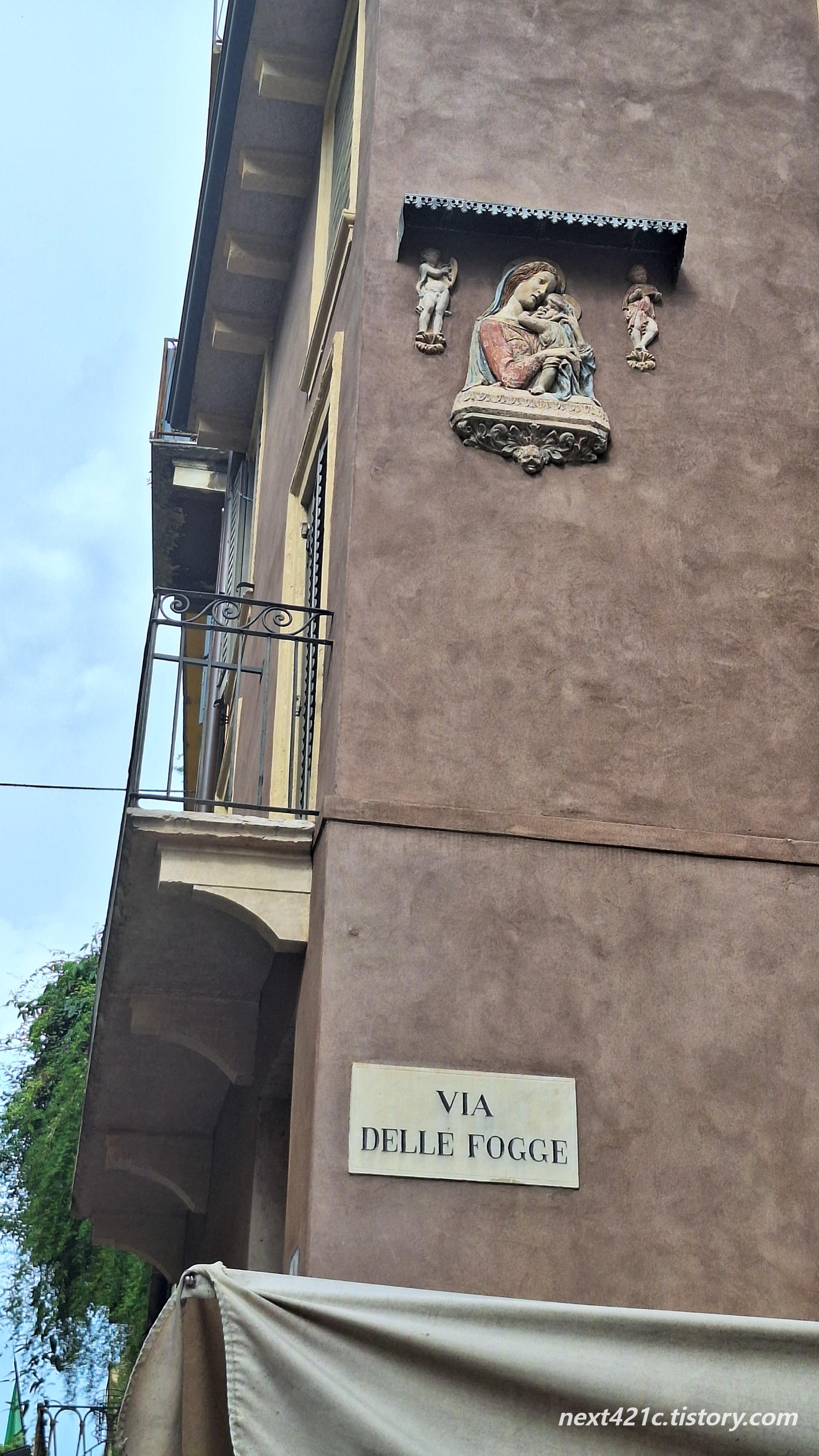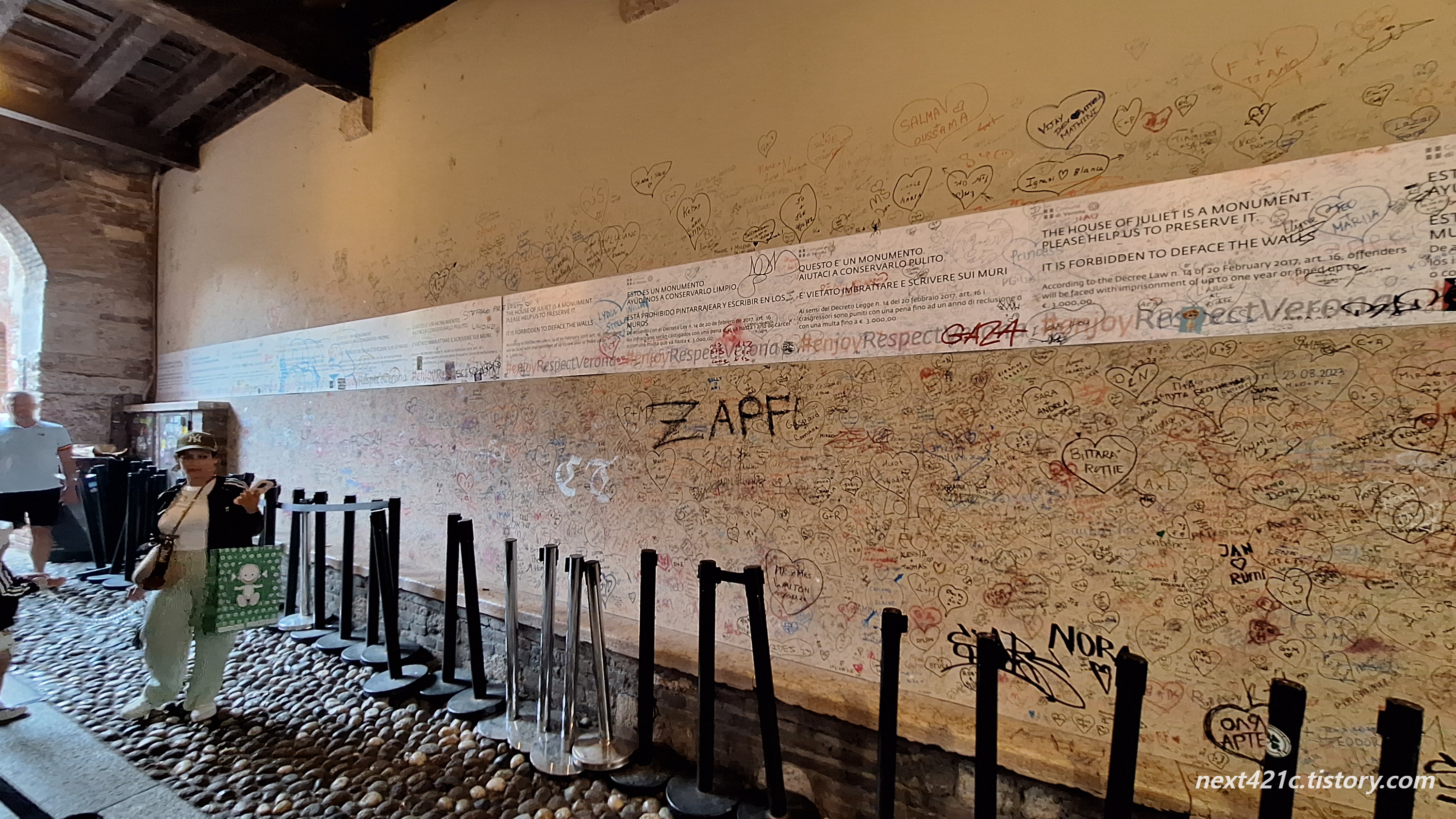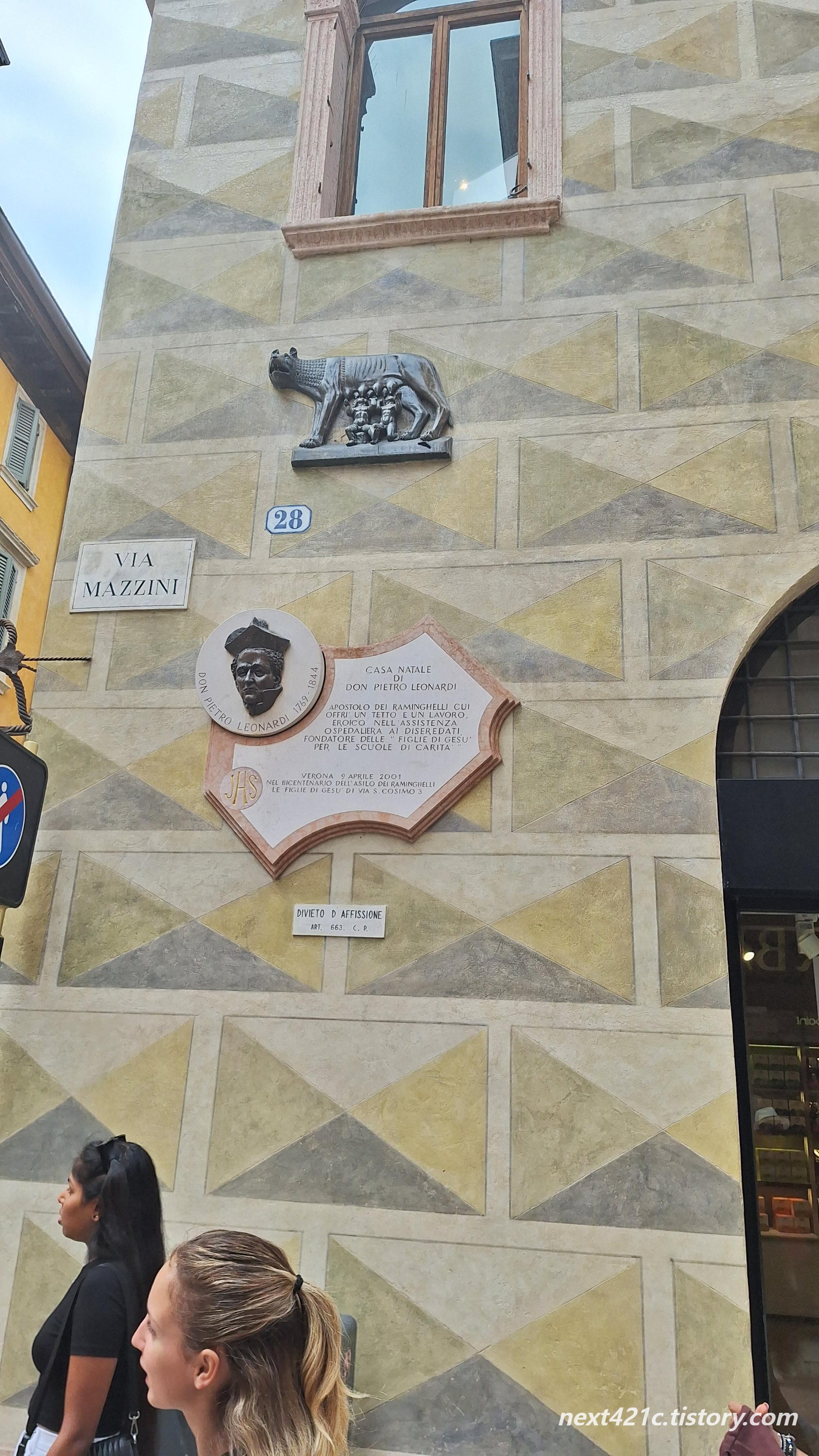 줄리엣의 집으로 가는 길에 본 건물과 건물 벽도 예사롭지 않다. 도시 전체를 문화유산으로 지정할 만하다. 아래 사진은 돈 피에트로 레오나르디 Don Pietro Leonardi의 생가 벽면. 위쪽에 있는 것은 늑대와 늑대 젖을 먹는 쌍둥이 로물루스와 레무스 Romulus and Remus로 로마 건국 신화를 나타내는 상징이다. 아래쪽에 있는 돈 피에트로 레오나르디(1769년 7월 17일 – 1844년 4월 9일)는 이탈리아의 신부이자 예수의 딸 수녀회 창립자로 1990년 교황 요한 바오로 2세에 의해 가경자(可敬者)(로마 가톨릭에서 시복 후보자에게 잠정적으로 주는 호칭)로 선포되었다고. 그리고 그 아래에는 이 시대 젊은이들. ^/^