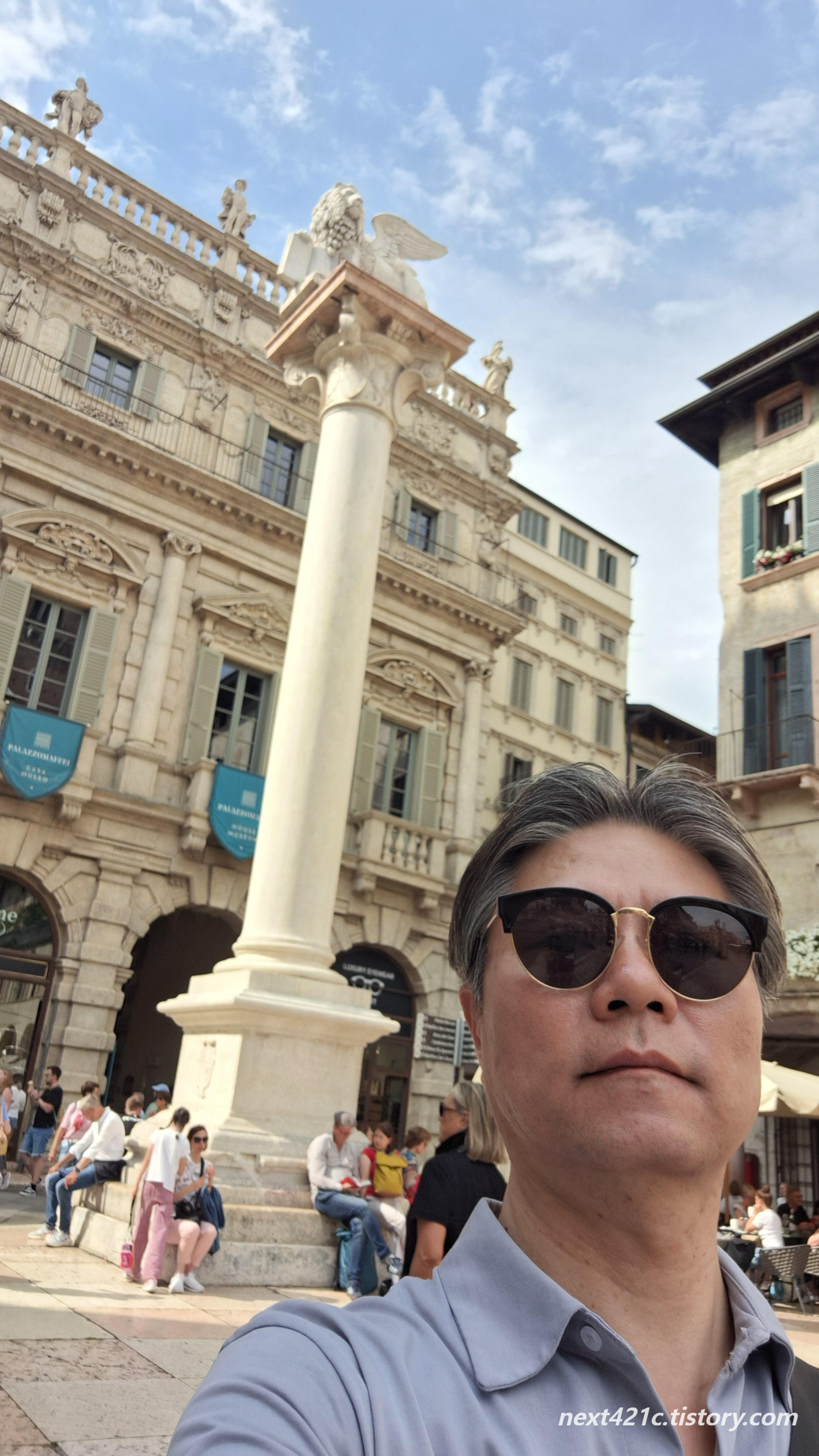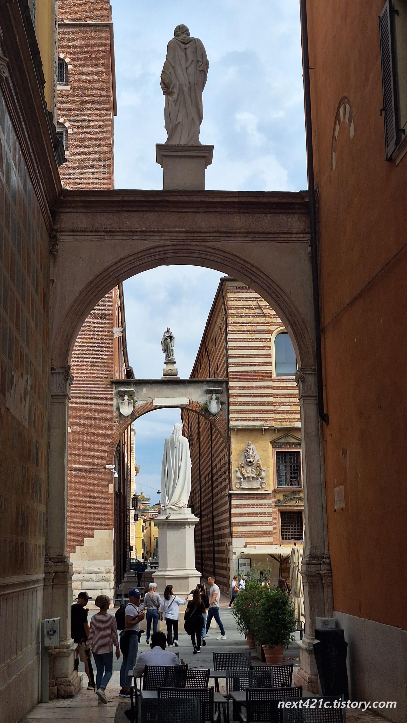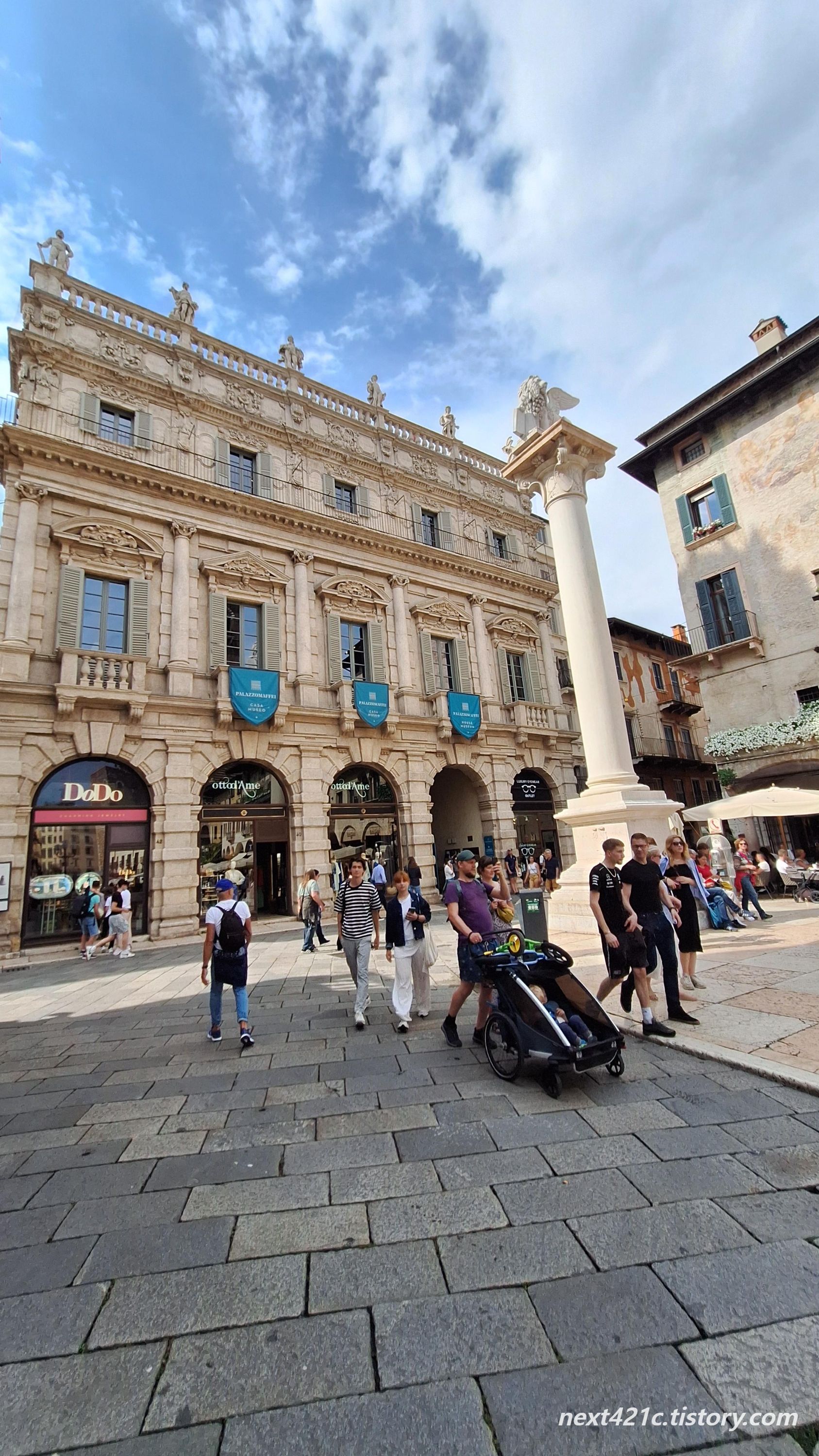 시뇨리 광장 Piazza del Signori은 광장 가운데 단테 석상이 서 있어 단테 광장 Piazza del Dante라고도 불린다고. 오른쪽에 서 있는 탑이 람베르티 탑 Torre dei Lamberti. 베로나에서 가장 높은 84m의 건축물로 1172년 람베르티 가문이 세웠다. 람베르티 탑이 있는 건물이 팔라초 델라 라지오네 Palazzo della Ragione.