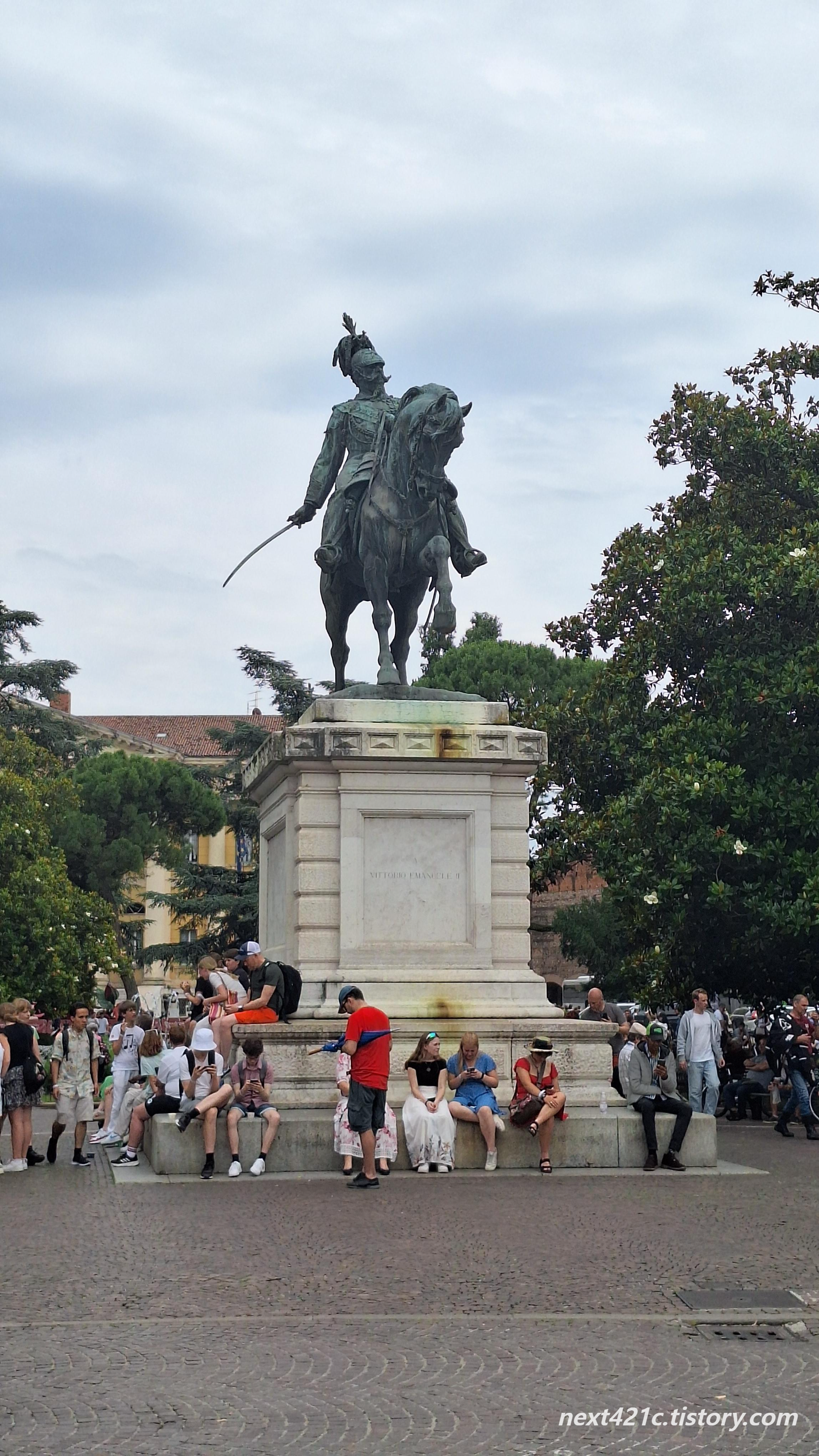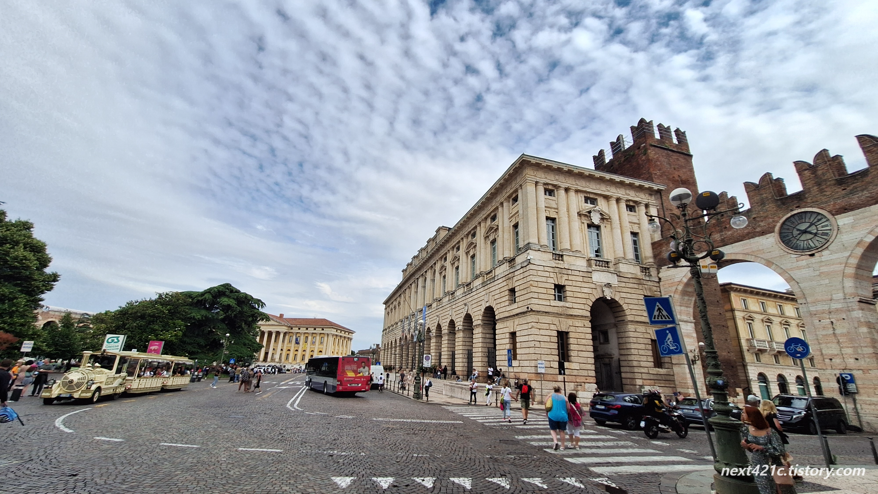 저 멀리 보이는 건물은 베로나 시청인 팔라초 바르비에리 Palazzo Barbieri. 설계한 주세페 바르비에리의 이름을 따라서 명명했다고. 오른쪽에 보이는 것은 브라 광장의 관문인 포르토니 델라 브라 Portoni della Brà. 이 관문에 연결된 건물은 그란 과르디아 궁전 Gran Guardia Palace.