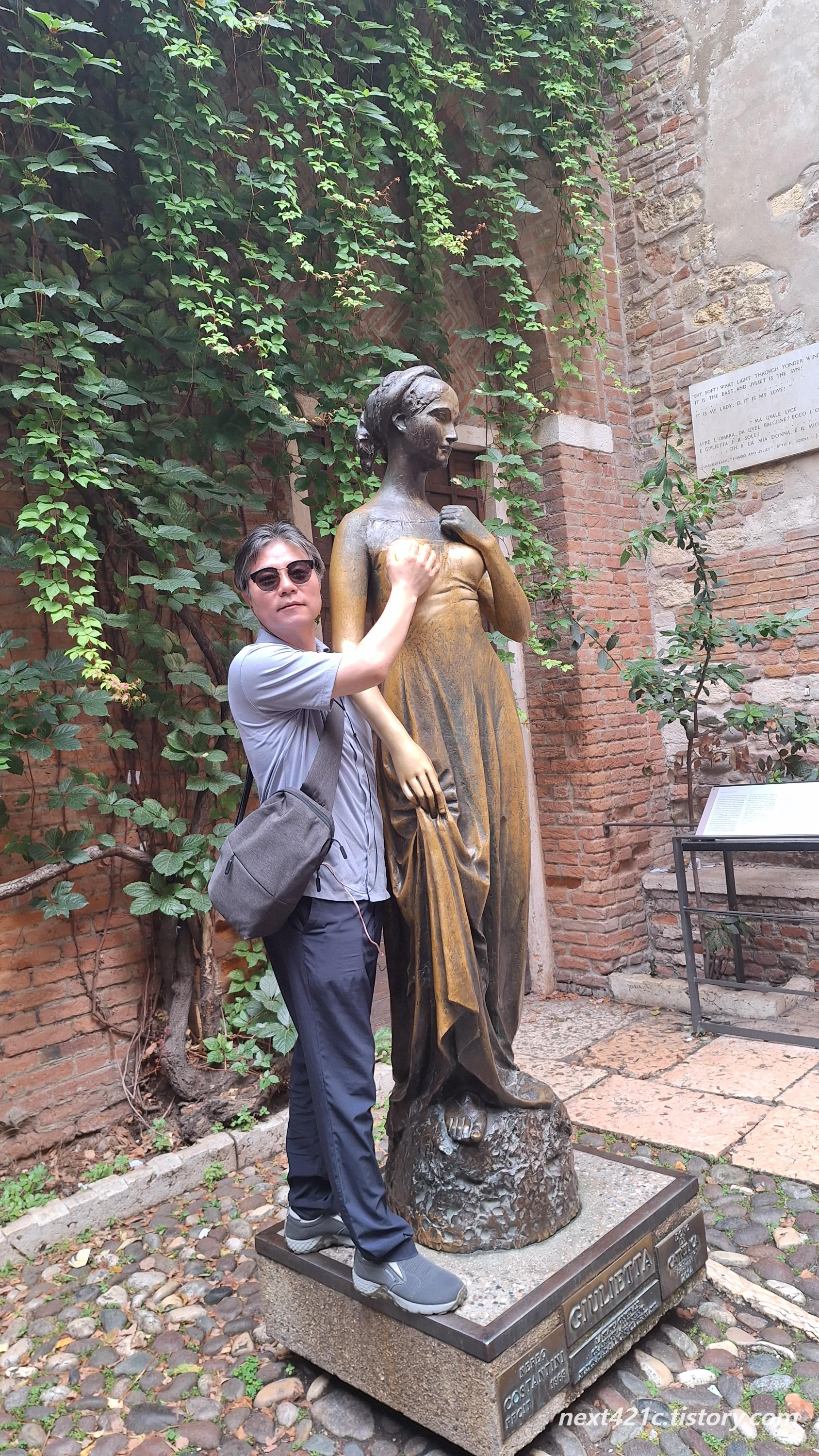 줄리엣 동상의 오른쪽 가슴을 만지며 소원을 빌면 사랑이 이루어진다는 속설이 많은 사람들을 줄 세운다. 나도 물론 그 줄에 참여했다.