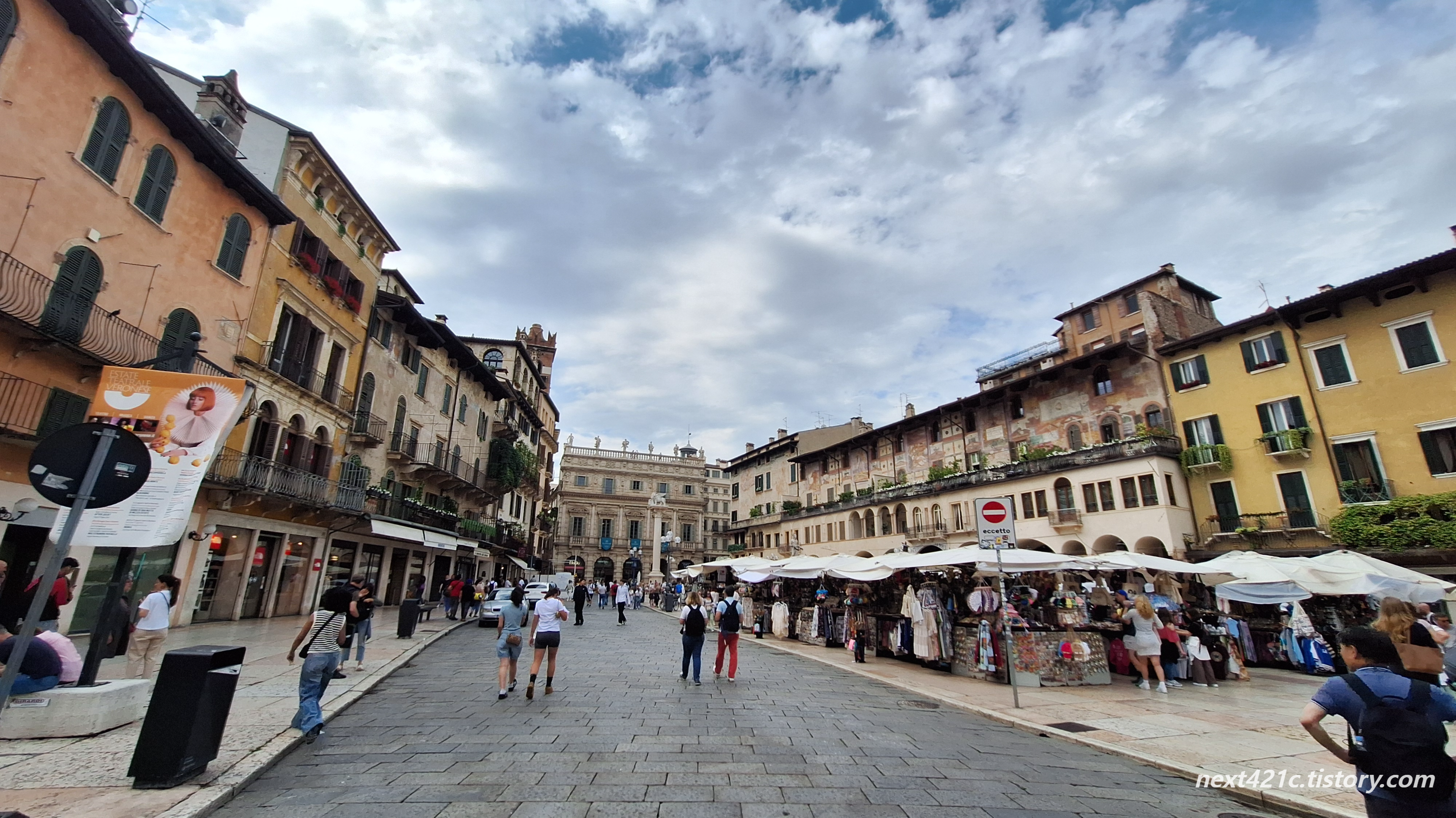 에르베 Erbe는 허브를 뜻하는 말로 과거 약초시장이 이곳에서 열렸기 때문에 에르베 광장 Piazza delle Erbe 이 되었다고 한다. 이곳에는 지금도 상설시장이 있다. 사진 중앙에 멀리 보이는 건물은 마페이 궁 Palazzo Maffei이다.