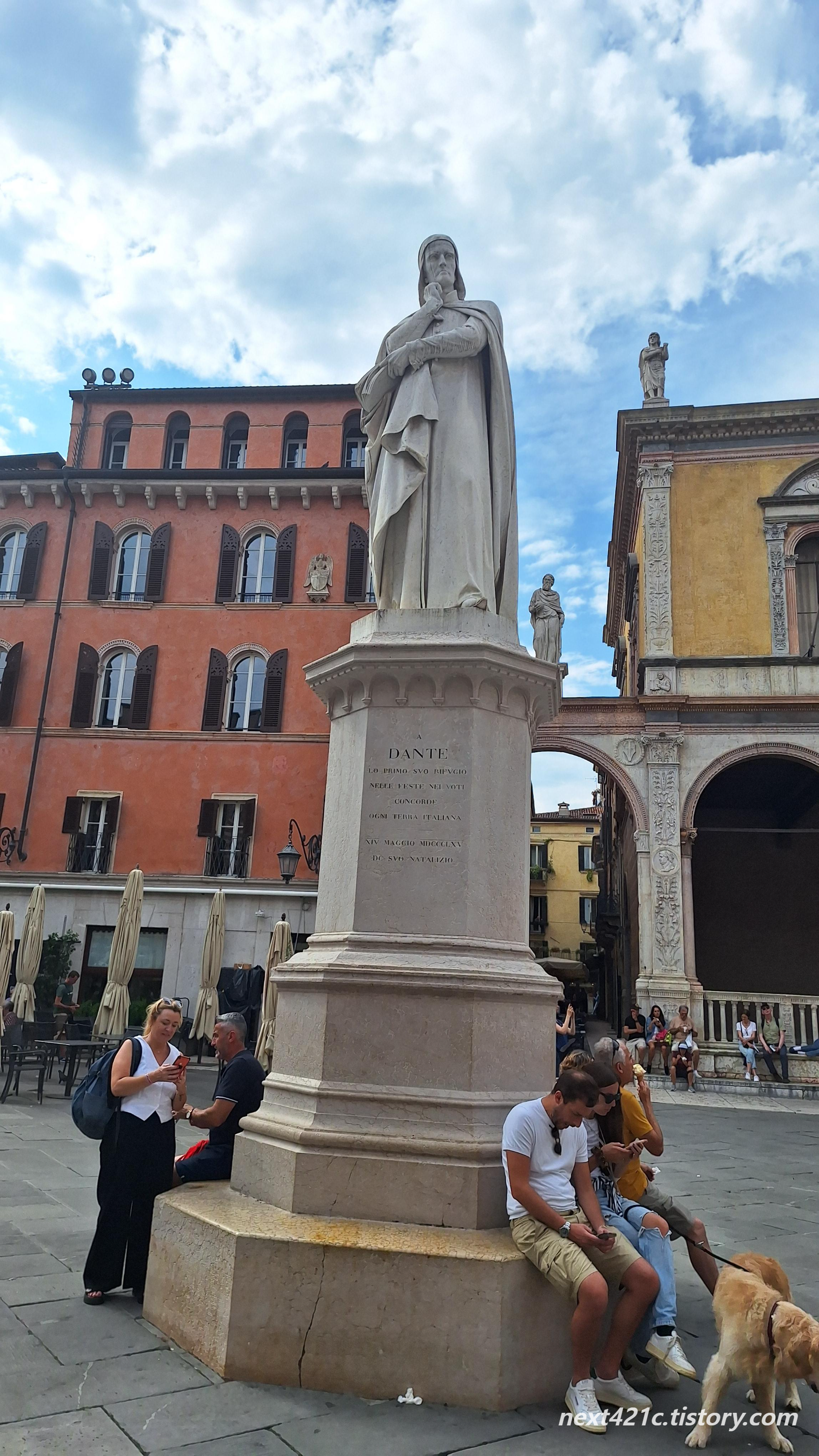 시뇨리 광장 Piazza del Signori에 서 있는 단테 석상과 그 아래에서 쉬고 있는 사람들.