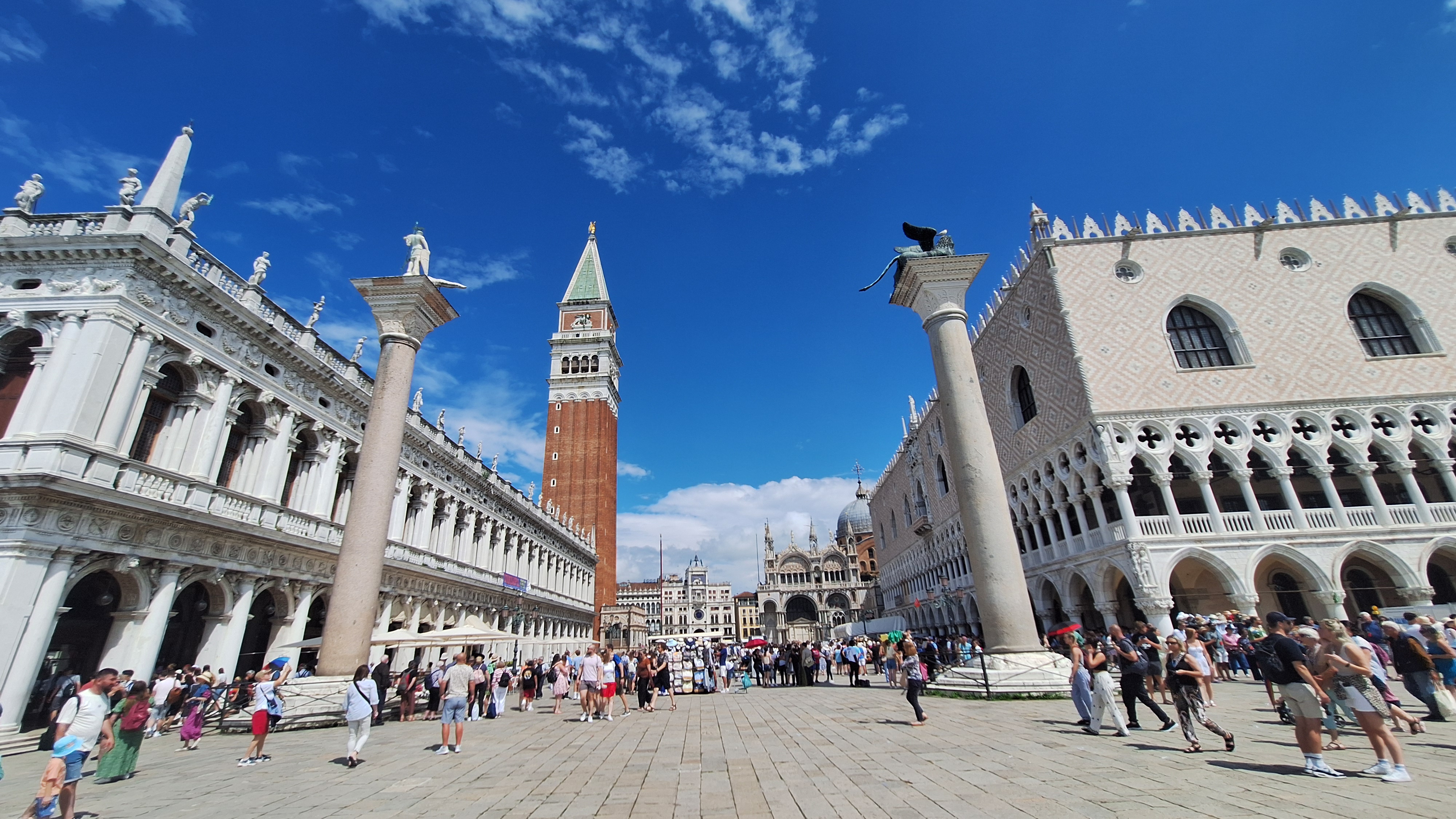 아래 사진 오른쪽에 있는 두칼레 궁전은 9세기 베네치아 공화국 총독을 위해 건설되었다. 고딕양식으로 지어진 이 건물은 보이는 화려함과 달리 요새로 설계된 건축물이다. 오른쪽 기둥 위에는 베네치아의 상징 동물인 날개 달린 사자가 있다.