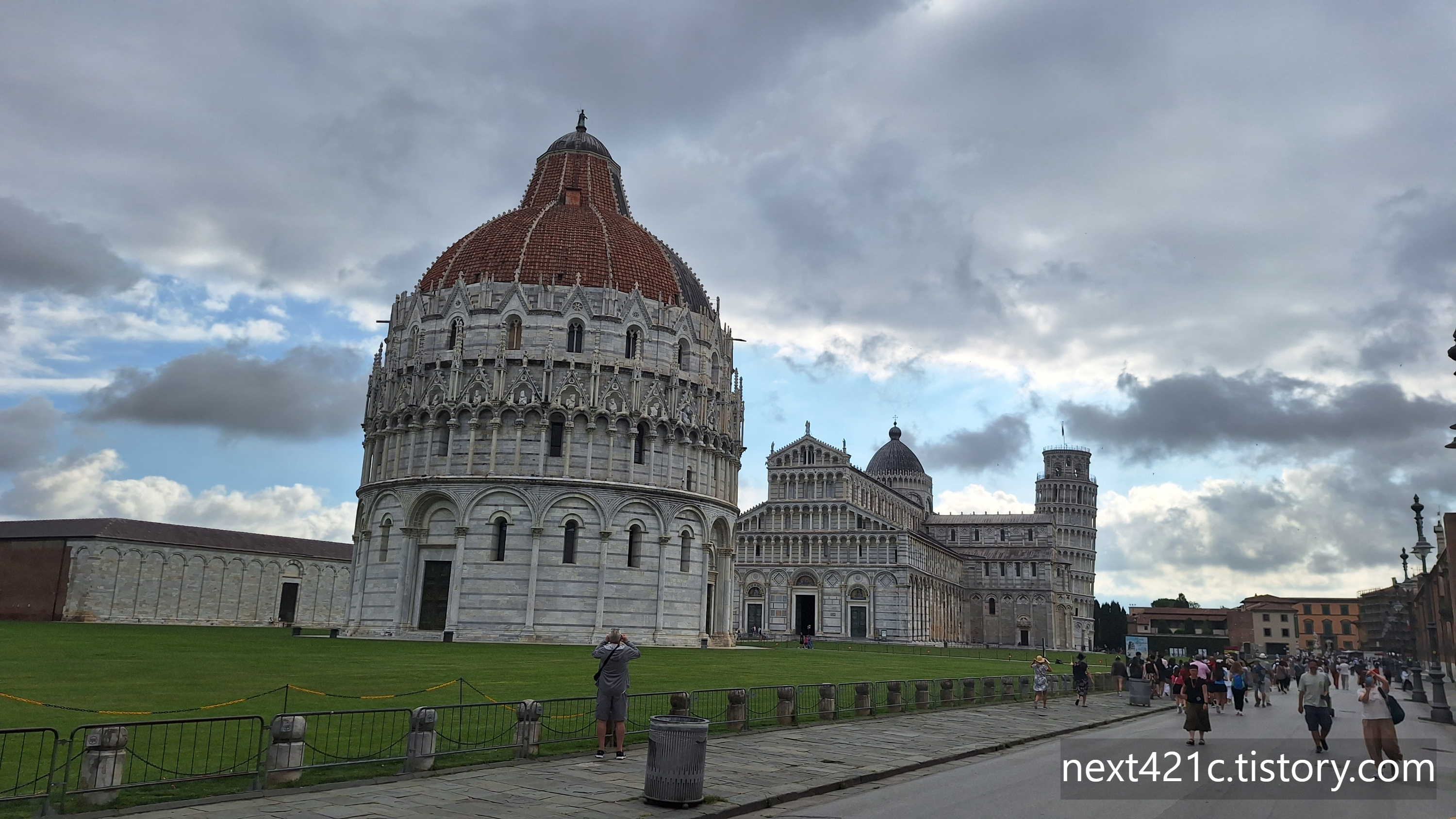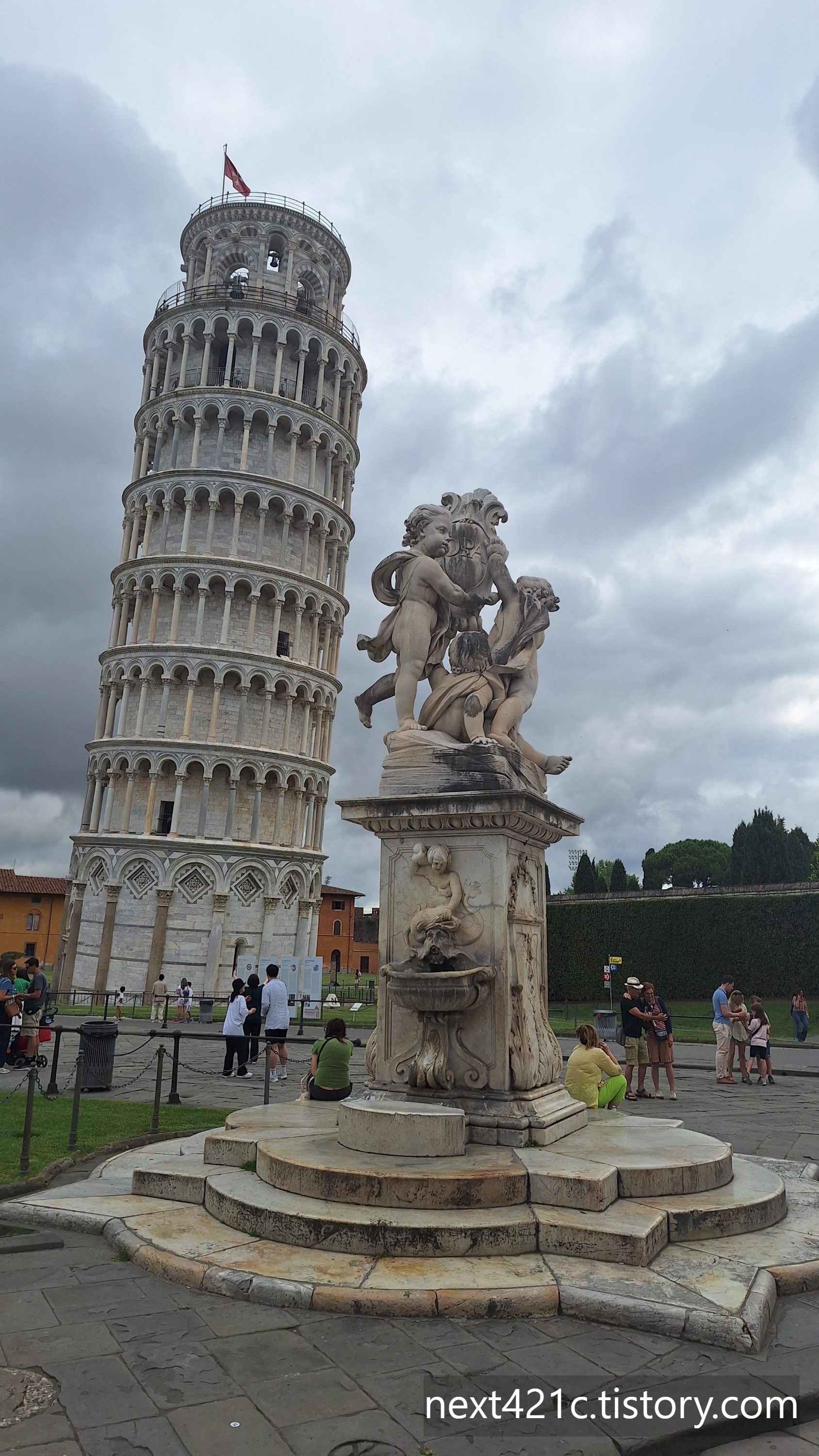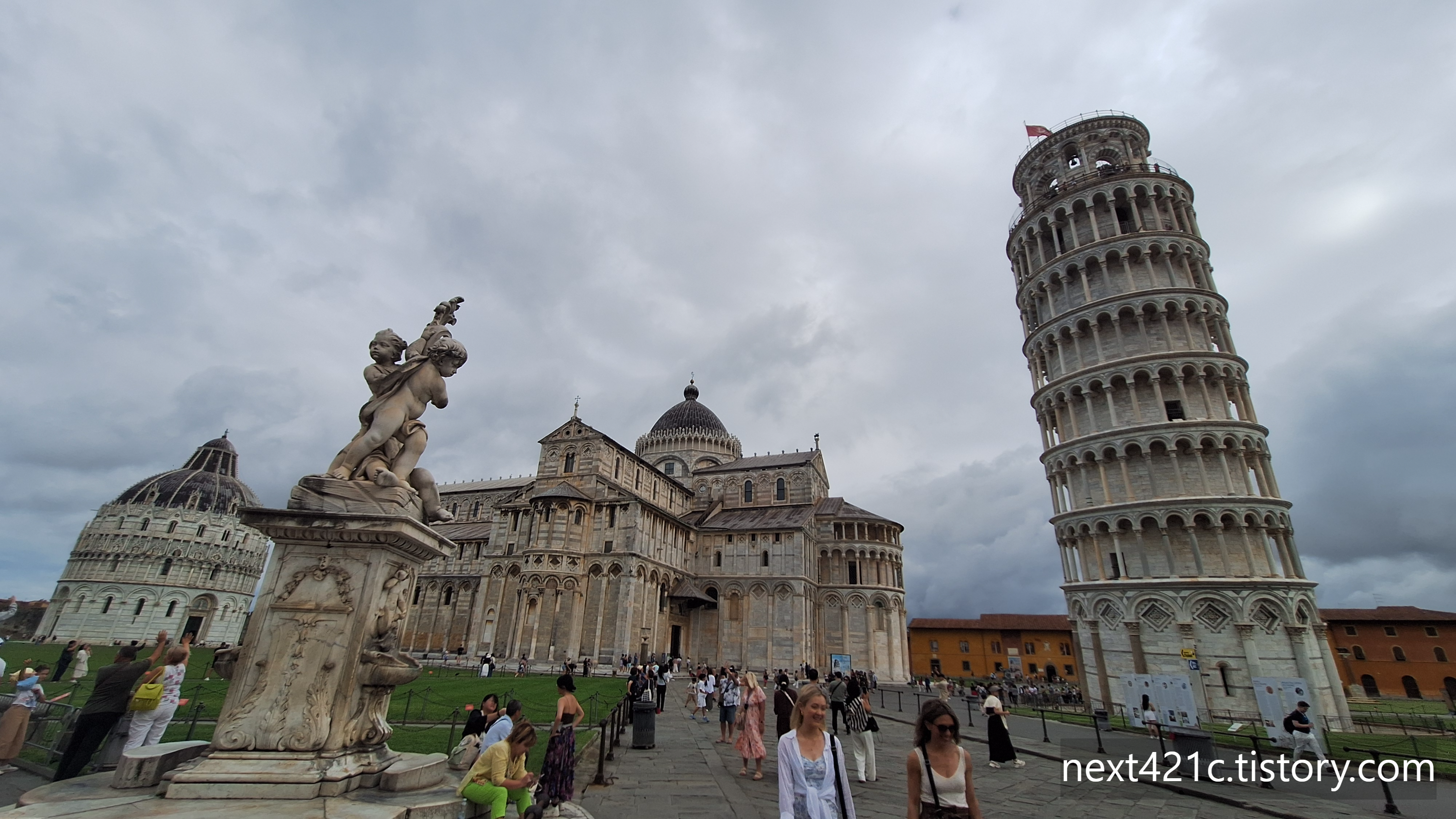광장의 주요 건축물을 한 장의 사진에 담았다. 아래 사진 왼쪽은 산 조반니 세례당, 가운데는 두오모 성당, 오른쪽은 당연히 사탑. 앞쪽에는 아기 천사상.