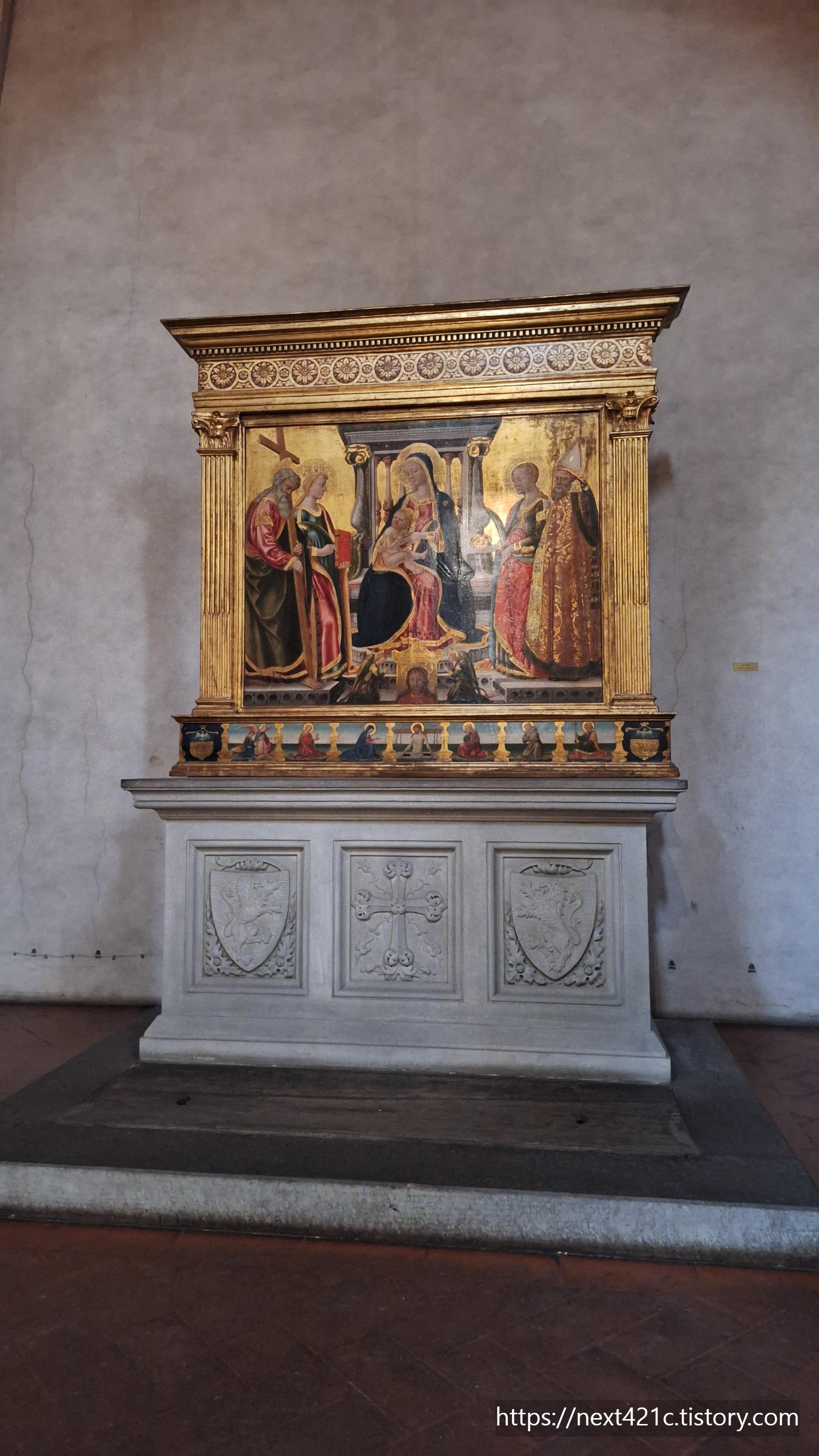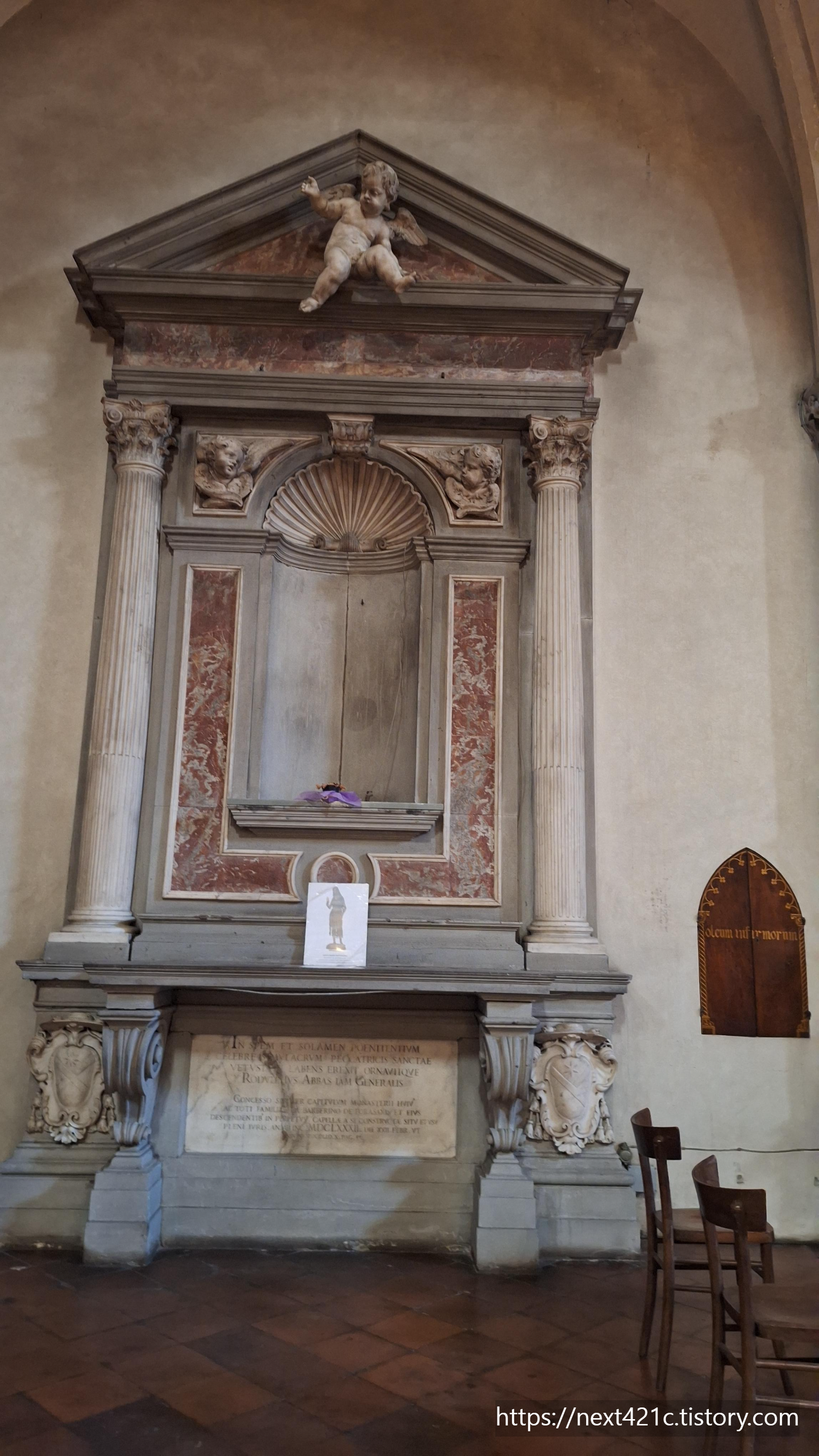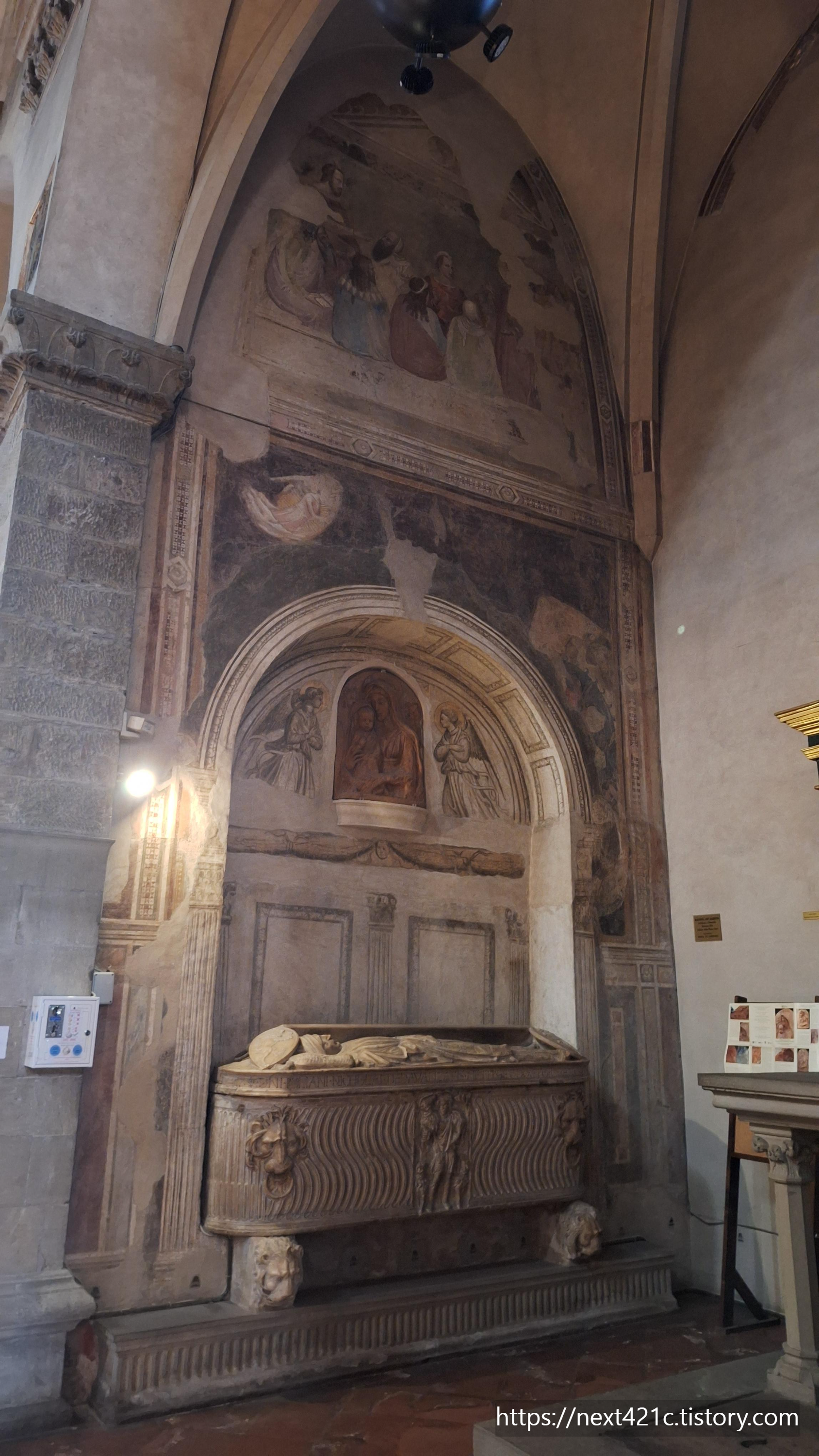 아래 사진은 스트로치 예배당 Cappella degli Strozzi. “이 고대 스트로치 예배당은 14세기에 푸치오 카파나에 의해 그려지고, 17세기에 완전히 개조되어 베르나르디노 포체티의 그림과 시오바니 카친트의 조각으로 장식되었으며, 1888년 피에로 스트로치 왕자에 의해 개관되었다”(그림 아래에 있는 설명문 내용).