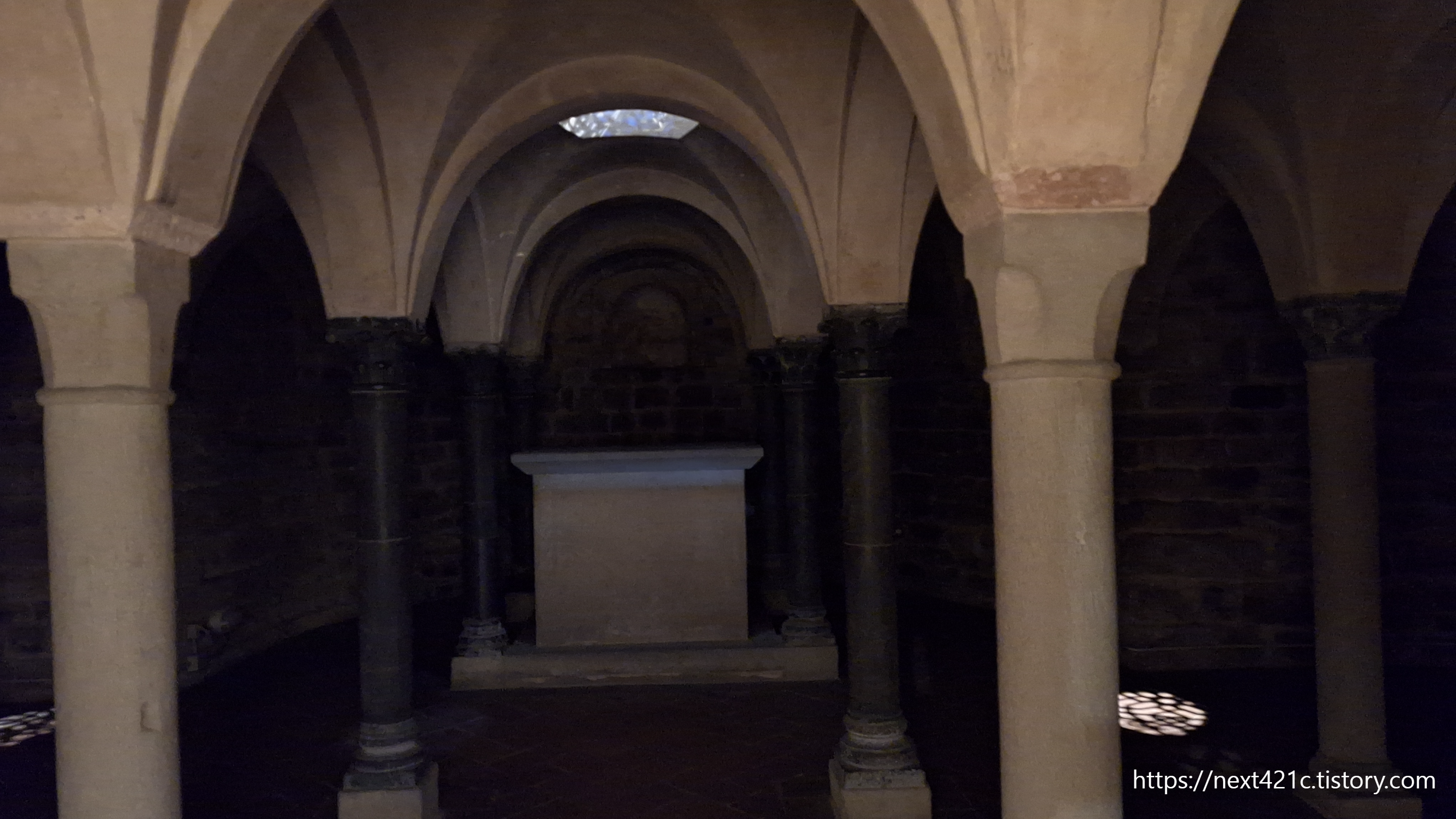 한때 교회의 누대를 지탱했던 두 개의 거대한 기둥의 기초가 연철 출입문의 왼쪽과 오른쪽에서 볼 수 있습니다. 아칸서스 잎 모양의 우아한 기둥이 사타구니 아치형 천장을 받치고 있습니다. 기둥 중 일부는 돌로 만들어졌고 다른 기둥은 녹색 프라토 대리석으로 만들어졌습니다. 옹벽이 세워지기 전 고대에 아르노 강변을 바라보던 왼쪽의 작은 창문은 네 개의 기둥으로 둘러싸인 로마네스크 양식의 제단이 이 독창적인 토굴을 완성합니다.” (deepL 번역, 약간 수정)