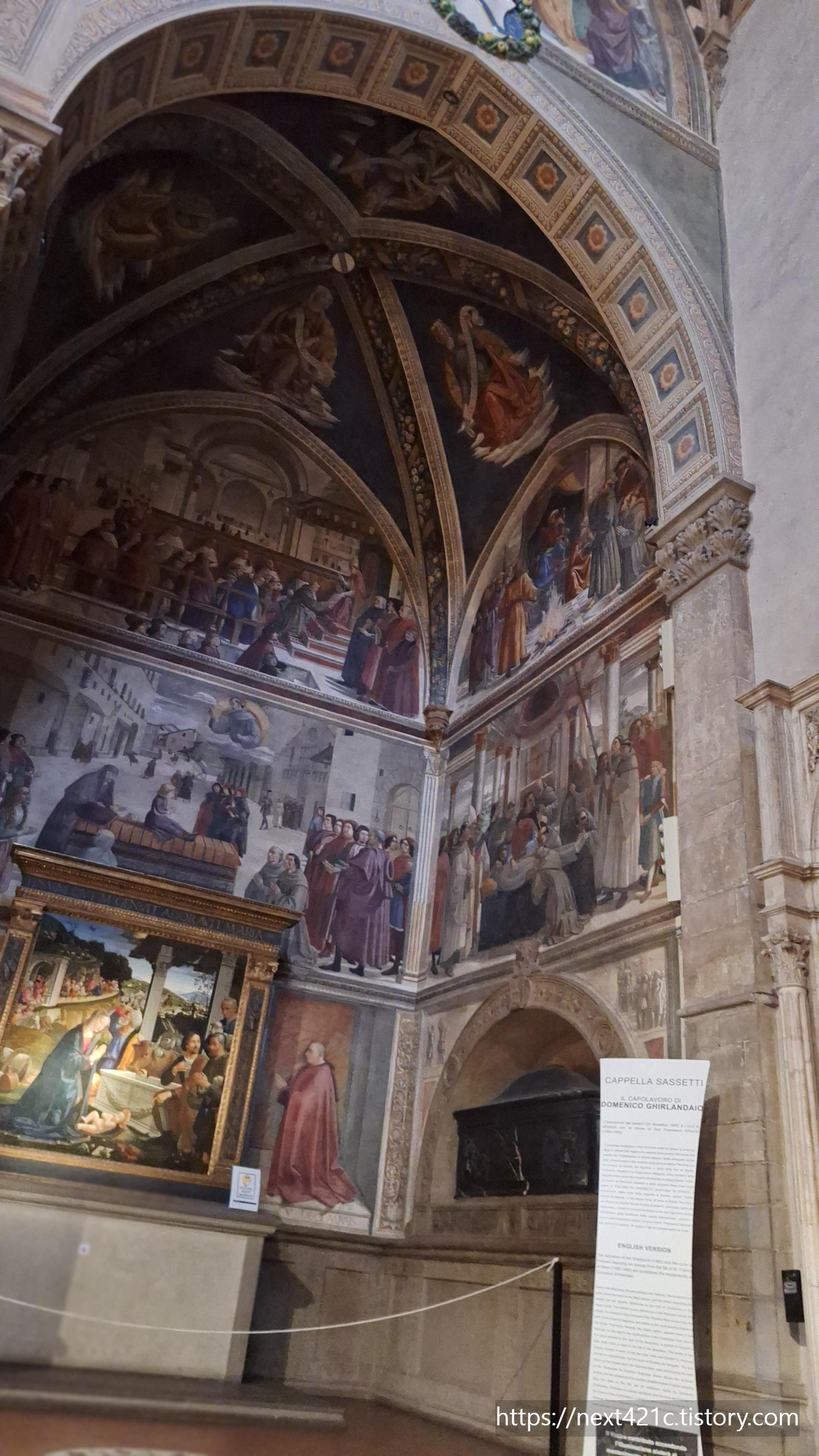 아래는 사세티 예배당 Sassetti Chapel의 왼쪽 벽. 위쪽 그림은 성 프란치스코의 생애 – 금욕 Life of St. Francis – Renunciation, 중간 그림은 성 프란치스코의 생애 - 성 프란치스코의 성흔(聖痕: 일부 성인의 몸에 나타난 것으로 여겨지는, 예수의 몸에 새겨진 못자국과 같은 상처) Life of St. Francis - Stigmata of Saint Francis. 아래쪽의 검은 물체는 네라 코르시 사세티의 석관 sarcophagus of Nera Corsi Sassetti.