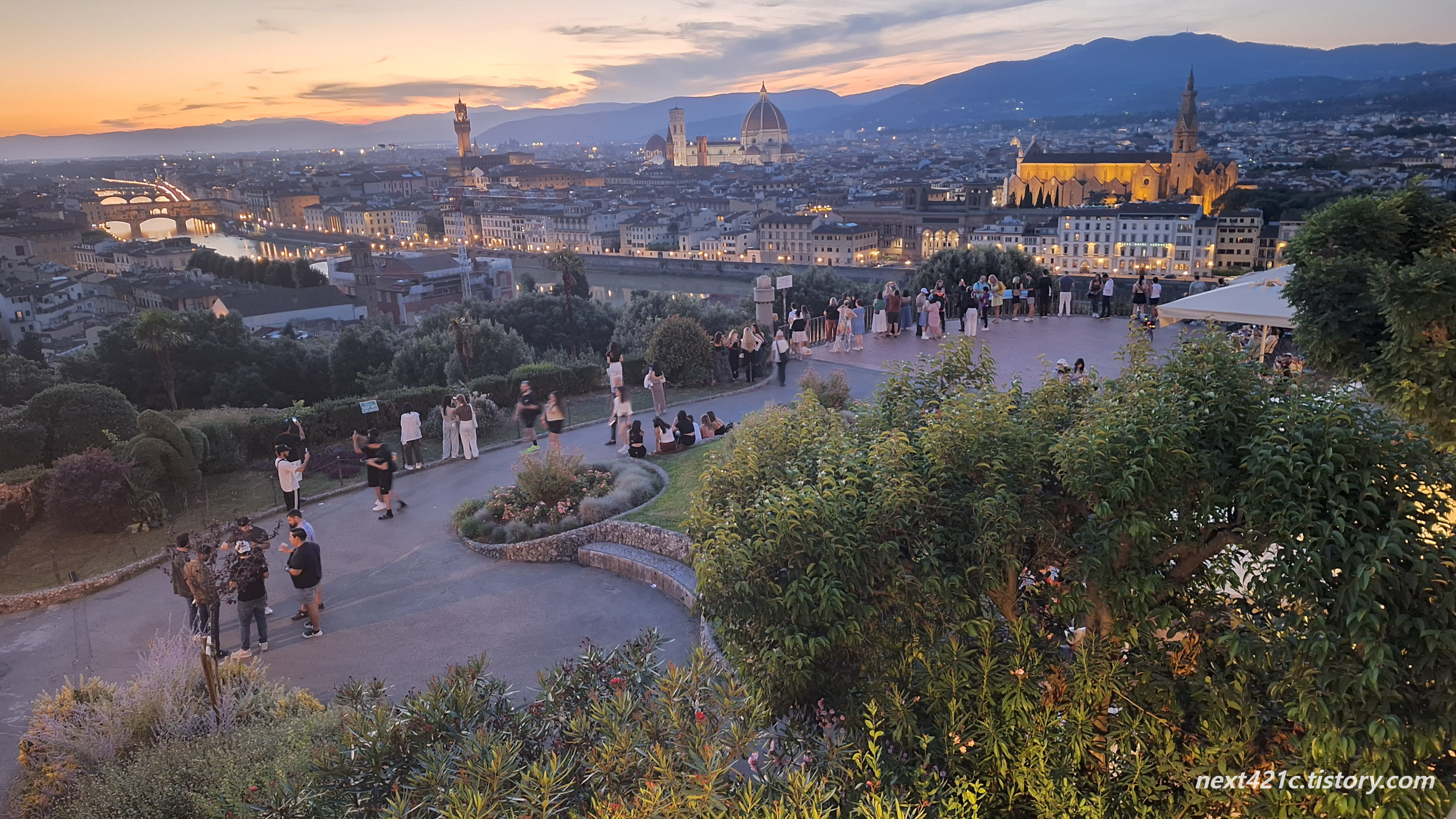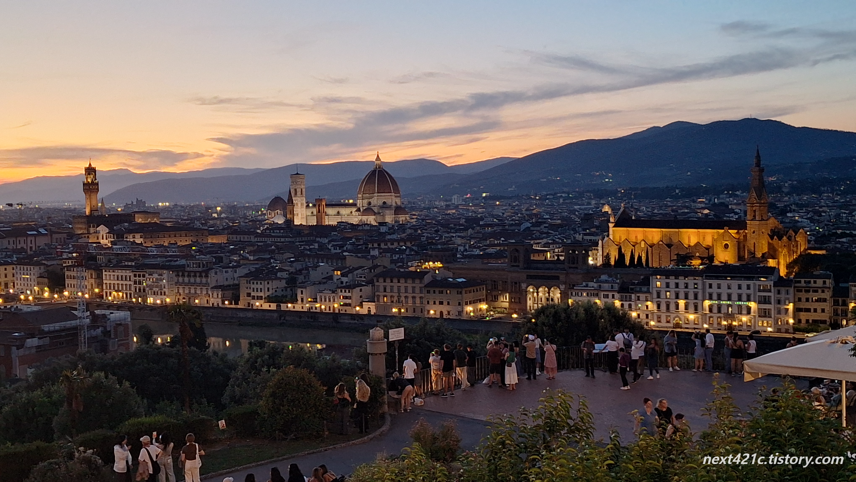 미켈란젤로 광장에 버스 진입이 제한된다는 이유로 패키지 일정에서 미켈란젤로 광장 방문이 삭제되었다. 그렇다고 이대로 포기할 순 없지. 저녁 식사 후에도 한낮 같은 7시, 패키지 참가자들끼리 의기투합해 8시경 미켈란젤로 광장으로 가기로 했다. 이 날 피렌체에서의 야행이 이번 이탈리아 여행에서 가장 즐거웠다. 역시 어디를 가느냐 못지않게 누구랑 가느냐도 중요하다.