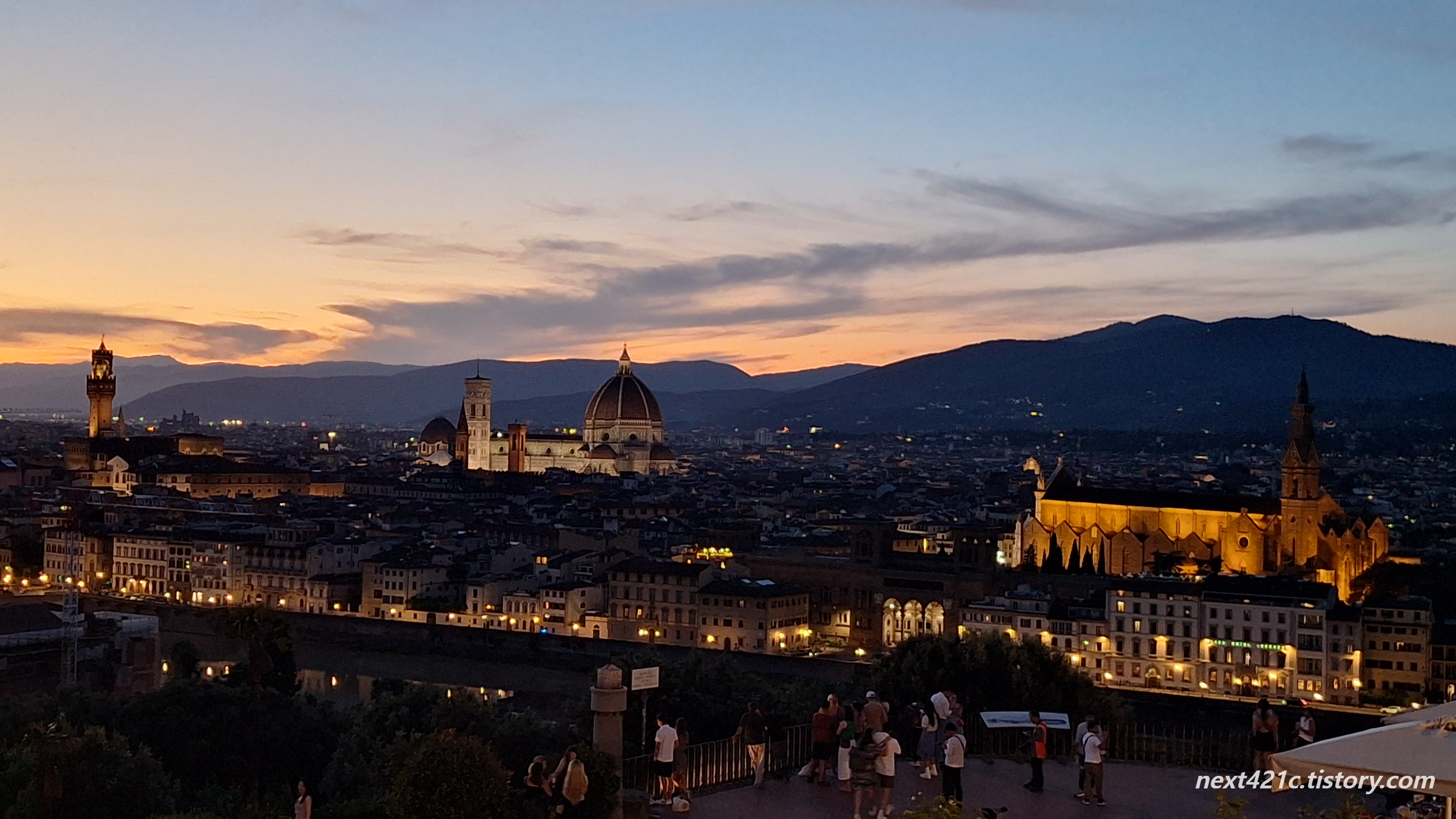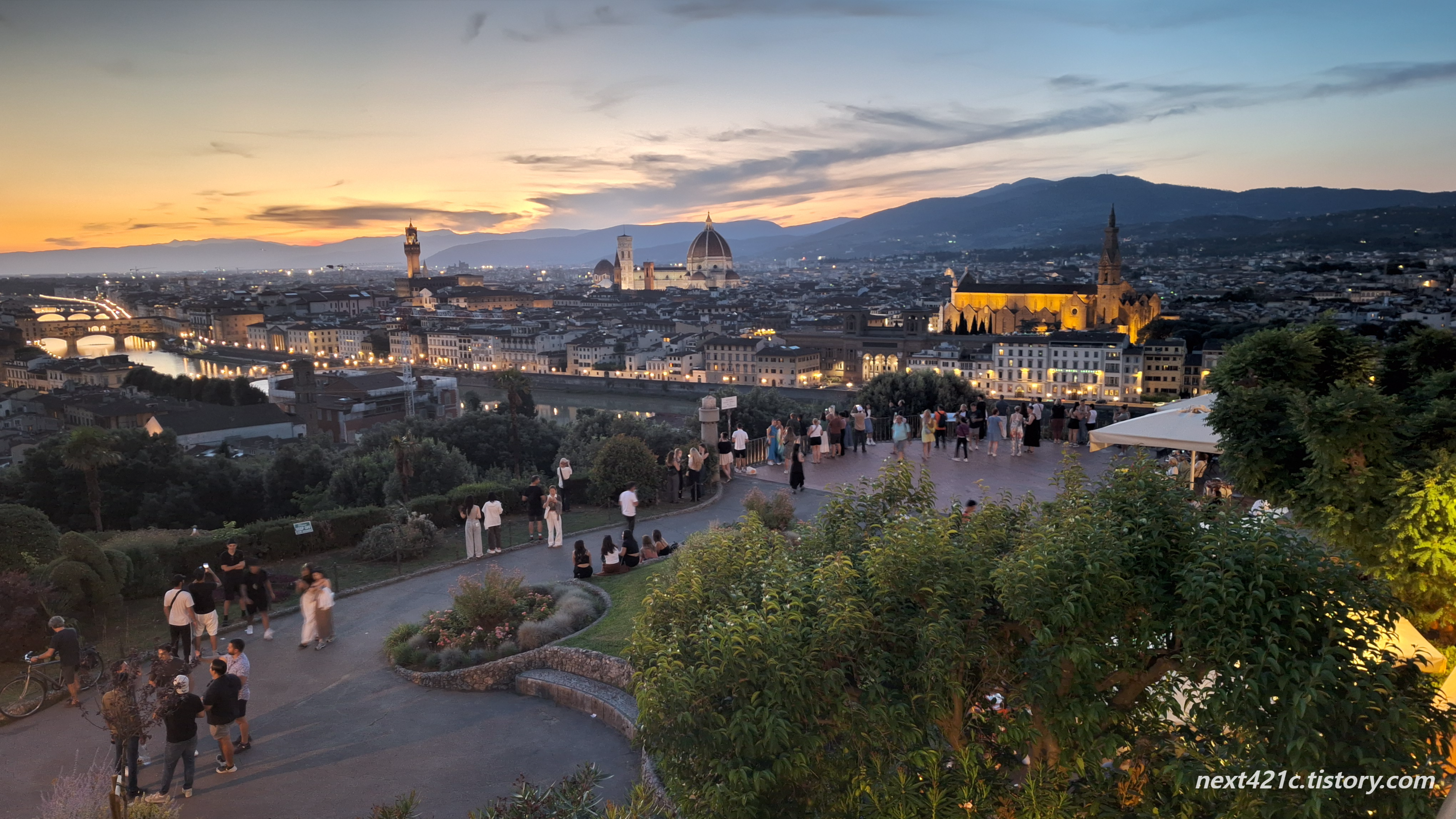 미켈란젤로 광장에 버스 진입이 제한된다는 이유로 패키지 일정에서 미켈란젤로 광장 방문이 삭제되었다. 그렇다고 이대로 포기할 순 없지. 저녁 식사 후에도 한낮 같은 7시, 패키지 참가자들끼리 의기투합해 8시경 미켈란젤로 광장으로 가기로 했다. 이 날 피렌체에서의 야행이 이번 이탈리아 여행에서 가장 즐거웠다. 역시 어디를 가느냐 못지않게 누구랑 가느냐도 중요하다.