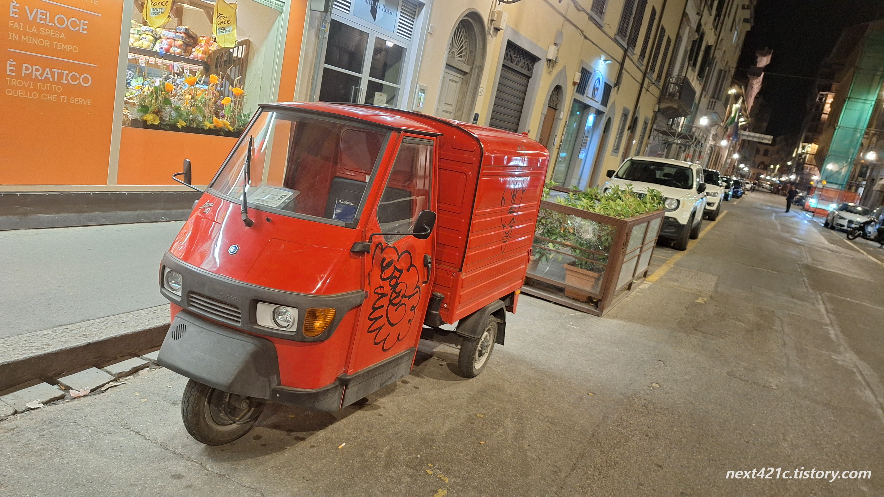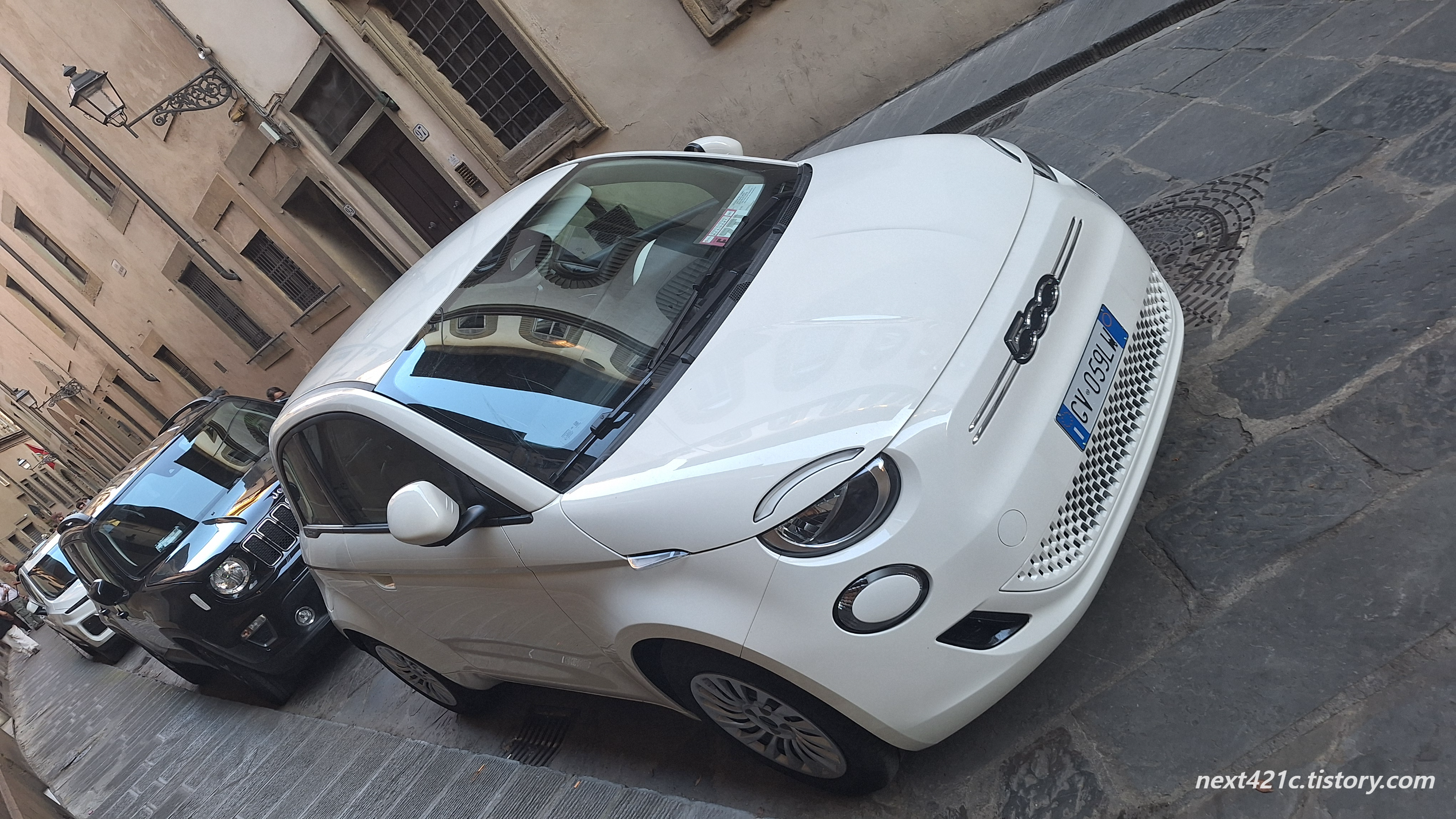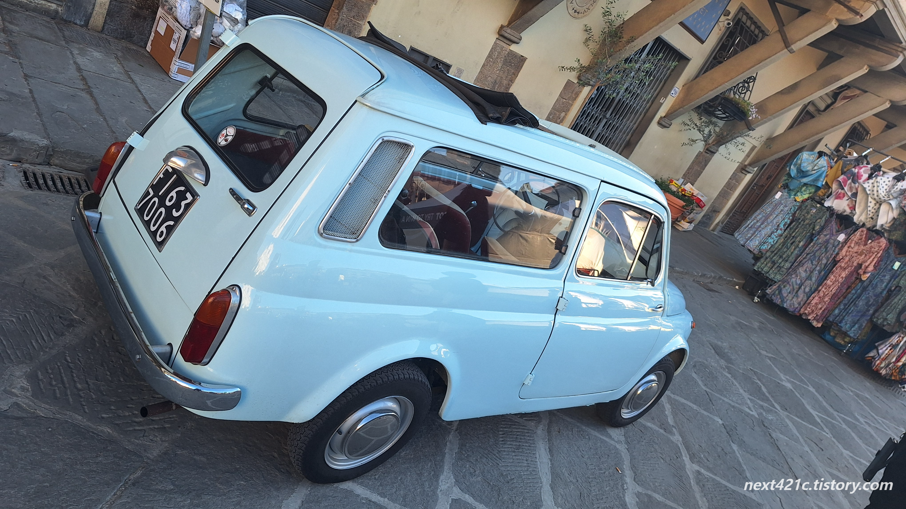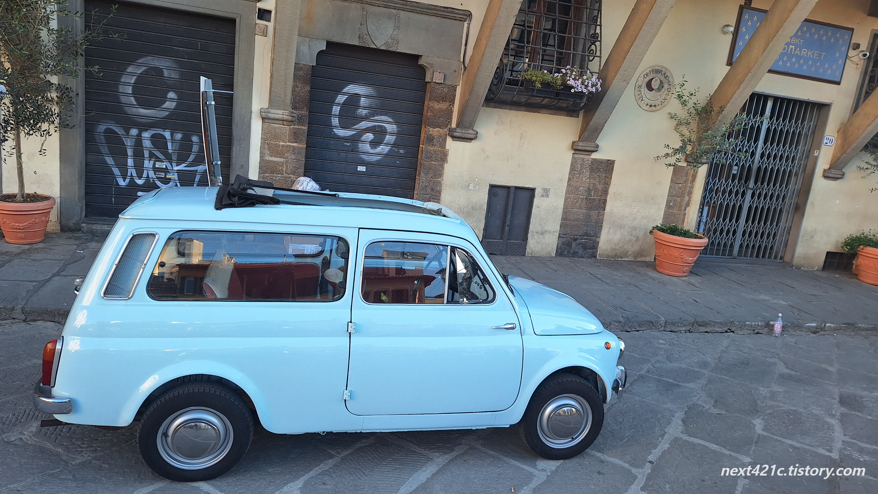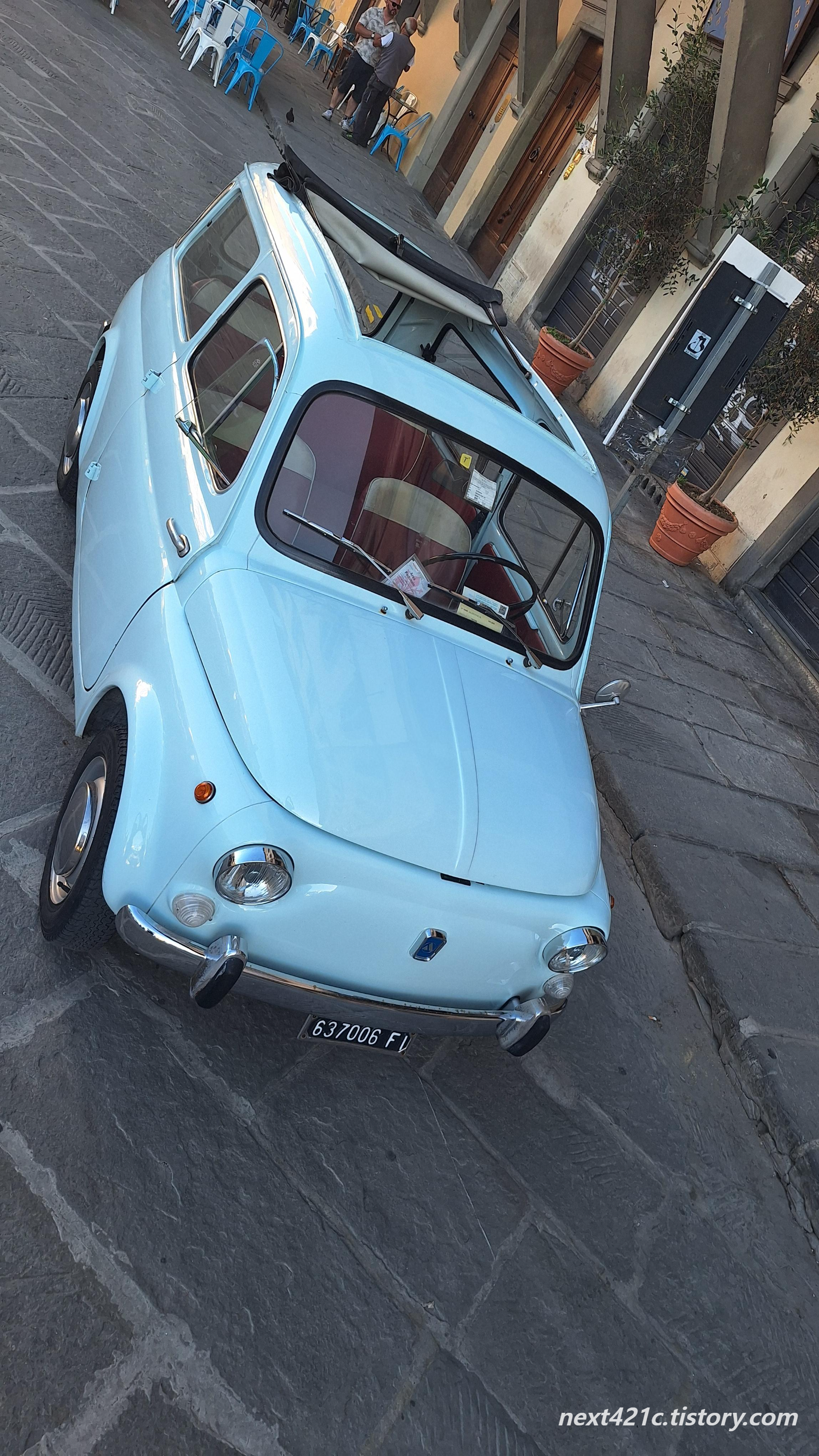 산타 크로체 광장에서 앙증맞고 예쁜 자동차를 발견했다. 난생처음 본 자동차. 그 유명한 피아트 500(친퀘첸토)의 1세대(1957년부터 1975년까지 생산) 중에서도 Nuova 500. 2기통 479CC 엔진 13마력.