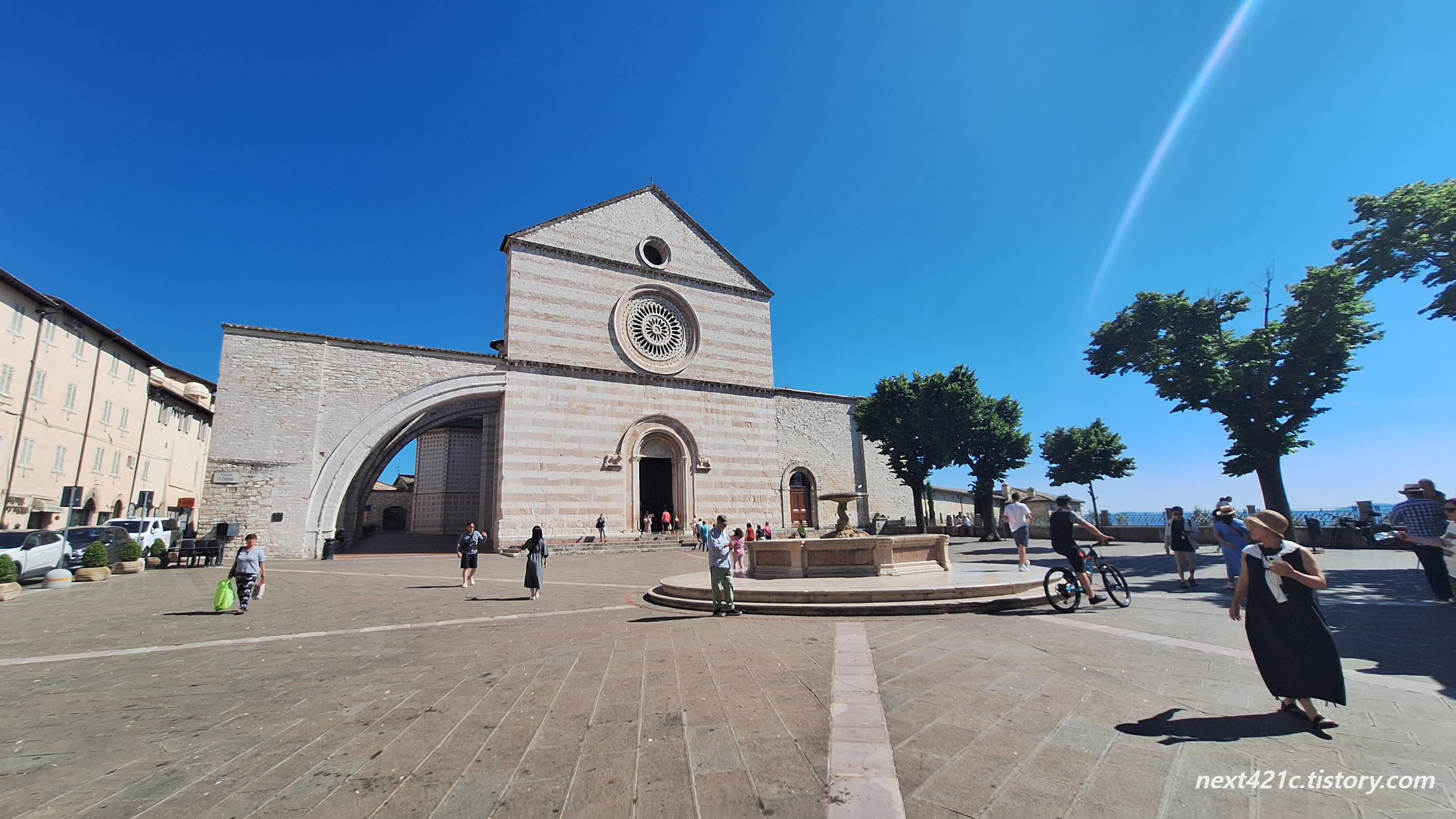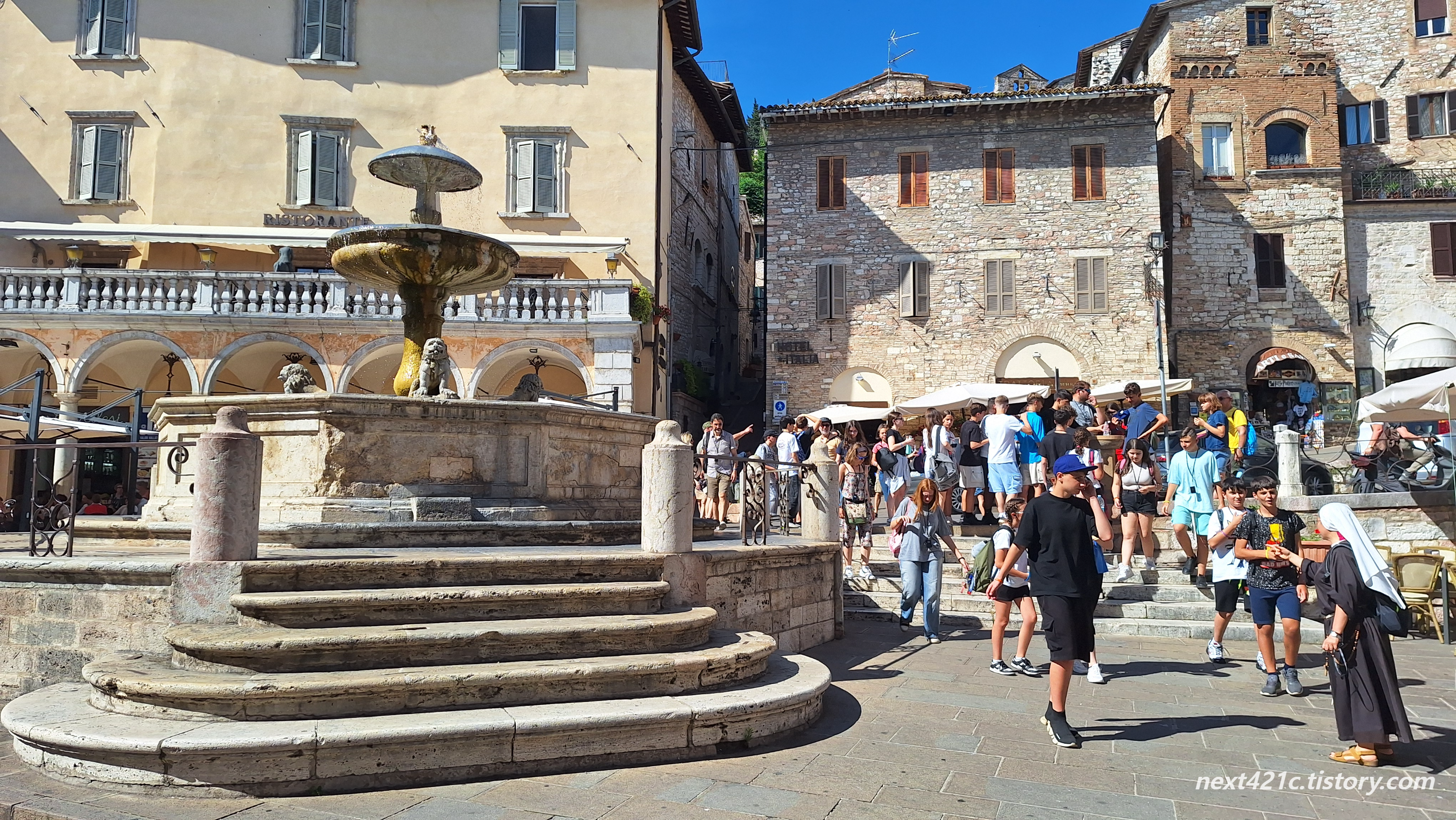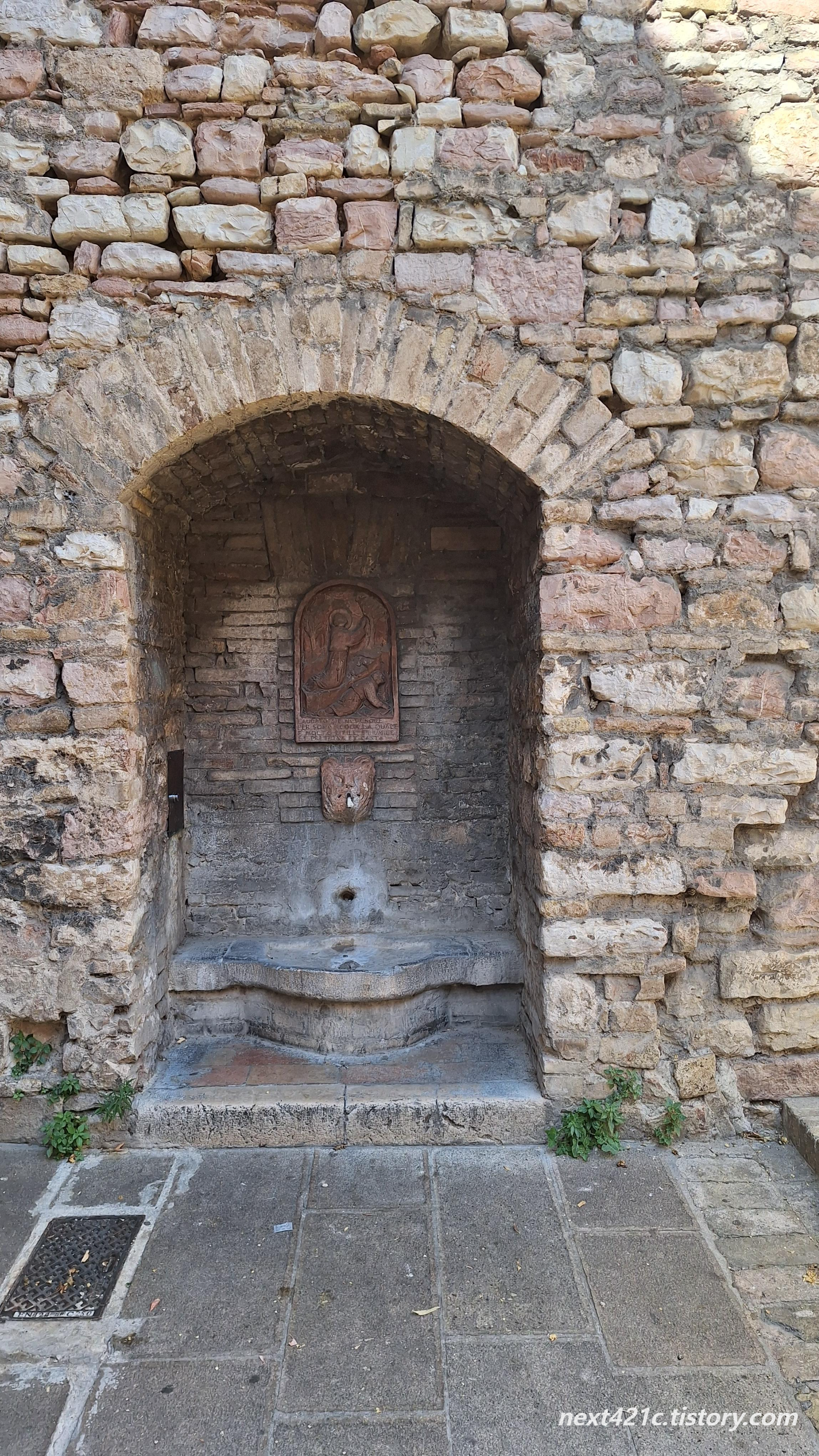 아래는 아씨시의 키에사 누오바 Chiesa Nuova (새 교회) 단지에 있는 13세기의 고대 분수대. 키에사 누오바 Chiesa Nuova 단지에는 교회, 프란체스코가 옷감을 팔던 가족 상점, 성인이 아버지에 의해 투옥되었던 계단, 박물관, 프란체스코 도서관 등이 있다.