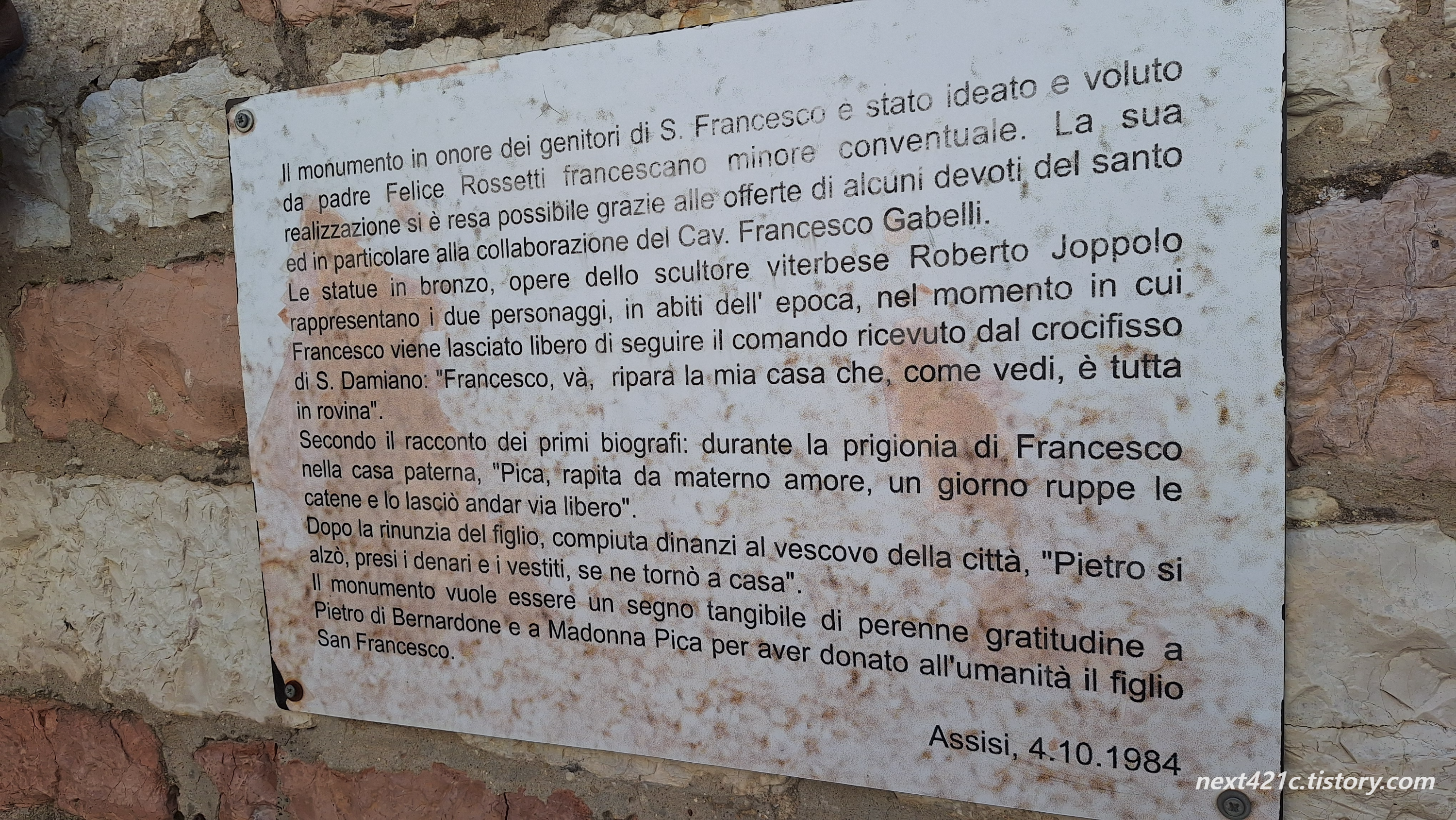 초기 전기 작가들의 기록에 따르면, 프란체스코가 아버지의 집에 수감되어 있을 때 "모성애에 사로잡힌 피카는 어느 날 쇠사슬을 끊고 그를 풀어주었다"고 합니다. 아들을 포기한 후, 도시의 주교 앞에서 "피카는 일어나 돈과 옷을 가지고 집으로 돌아갔다"고 합니다. 이 기념비는 인류에게 아들 성 프란체스코를 준 피에트로 디 베르나르돈과 마돈나 피카에게 영원한 감사의 표시로 만들어졌다고 전해집니다. (deepL 번역)