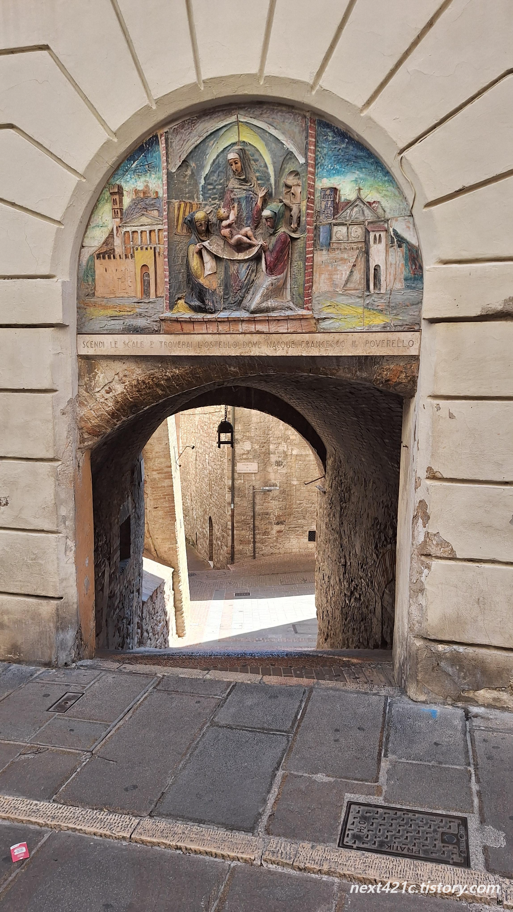 성 프란체스코가 태어난 작은 방으로 내려가는 계단 위 조각상. 조각상 아래 돌에 새겨진 문구는 “계단을 내려가면 가난한 자 프란체스코가 태어난 호스텔이 있다.”