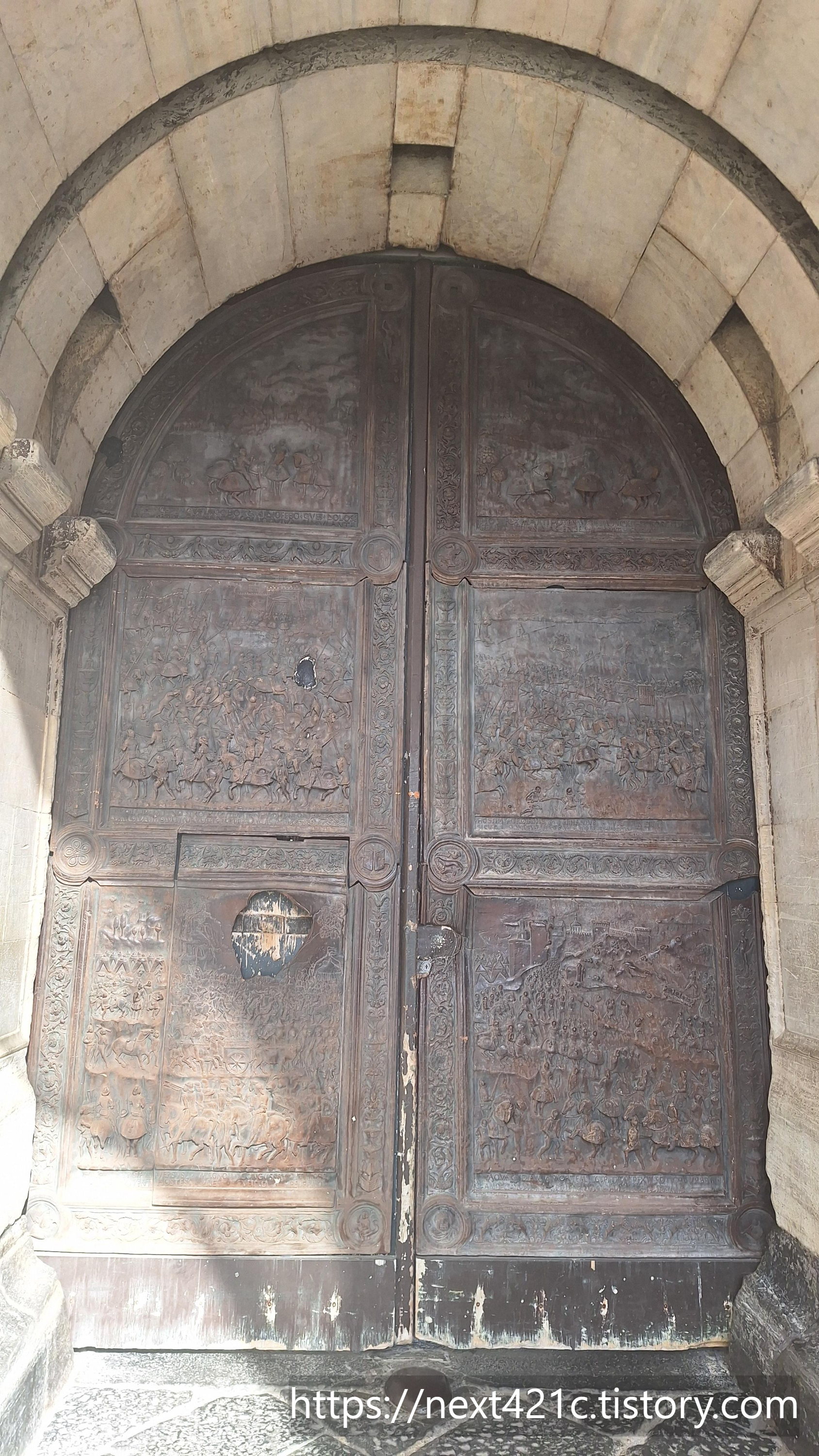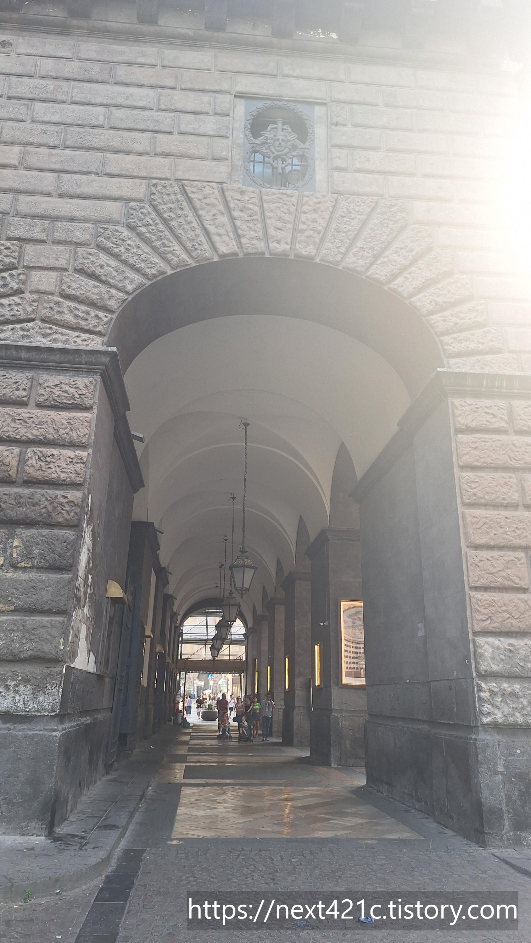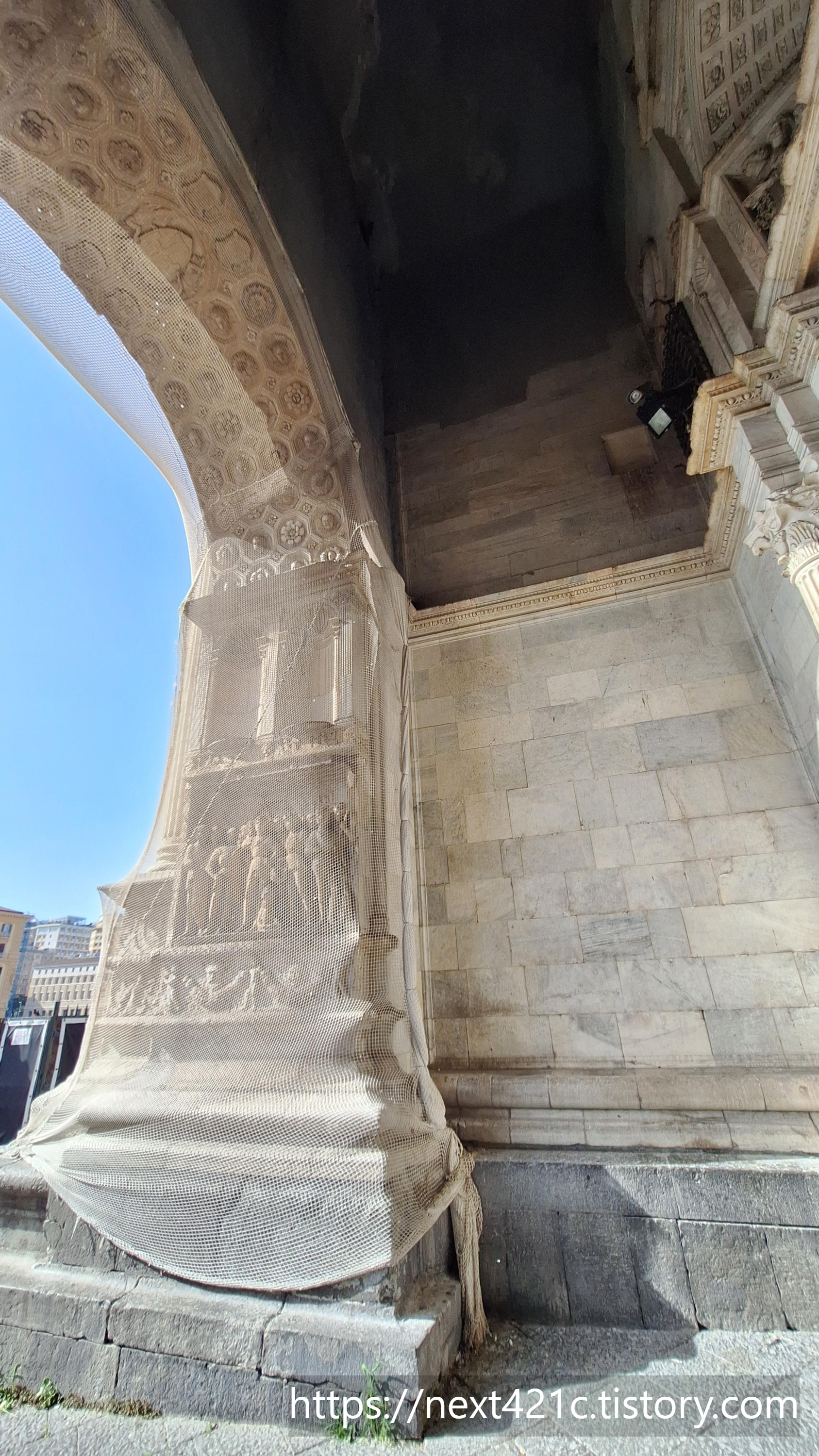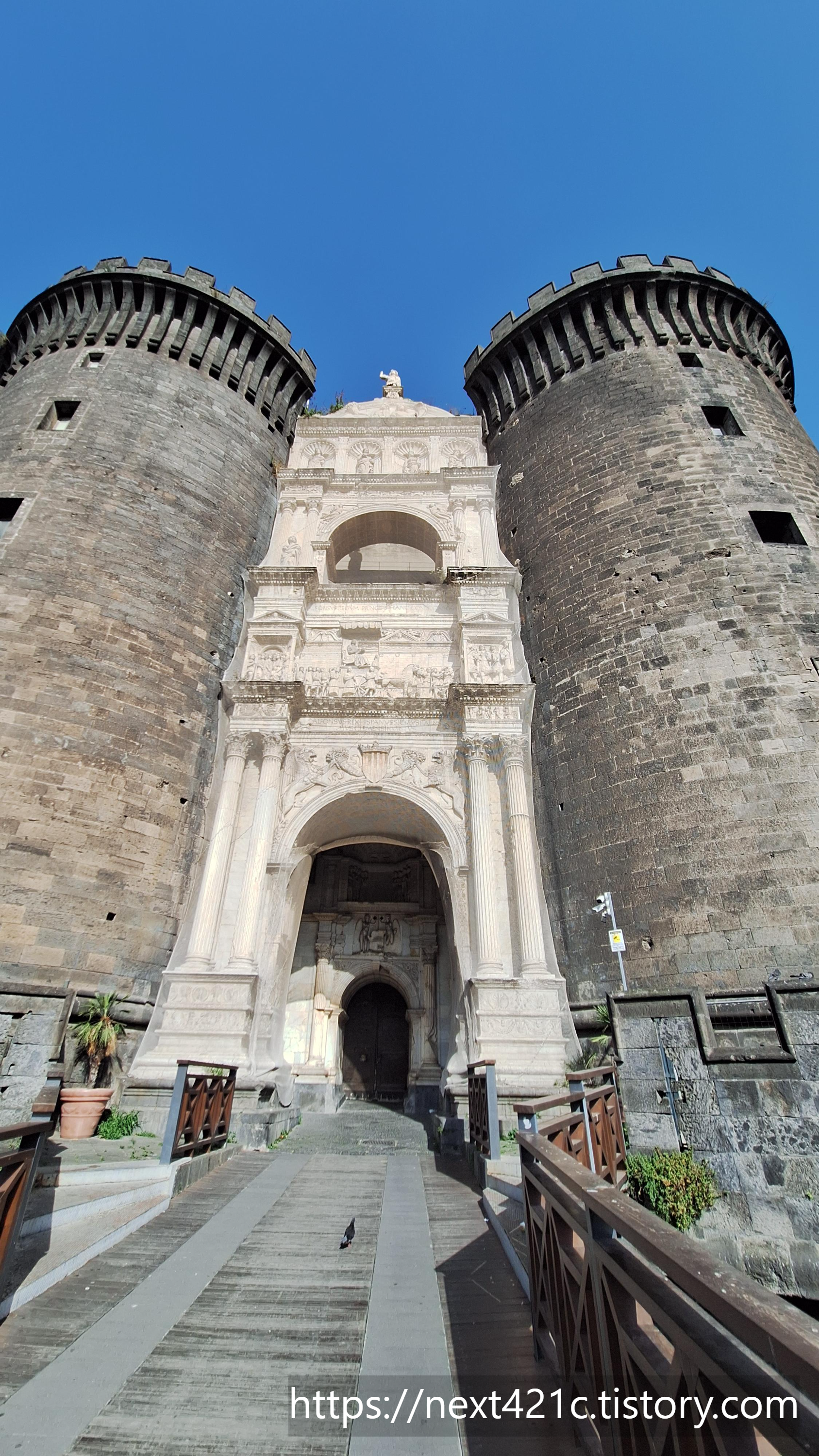 개선문처럼 생긴 입구는 1467년 스페인 아라곤의 알폰소 1세 Alfonso I가 나폴리 입성을 기념하여 나중에 만든 것이라고. 기존 건물과 대단히 이질적이다. 확실히 대비된다.