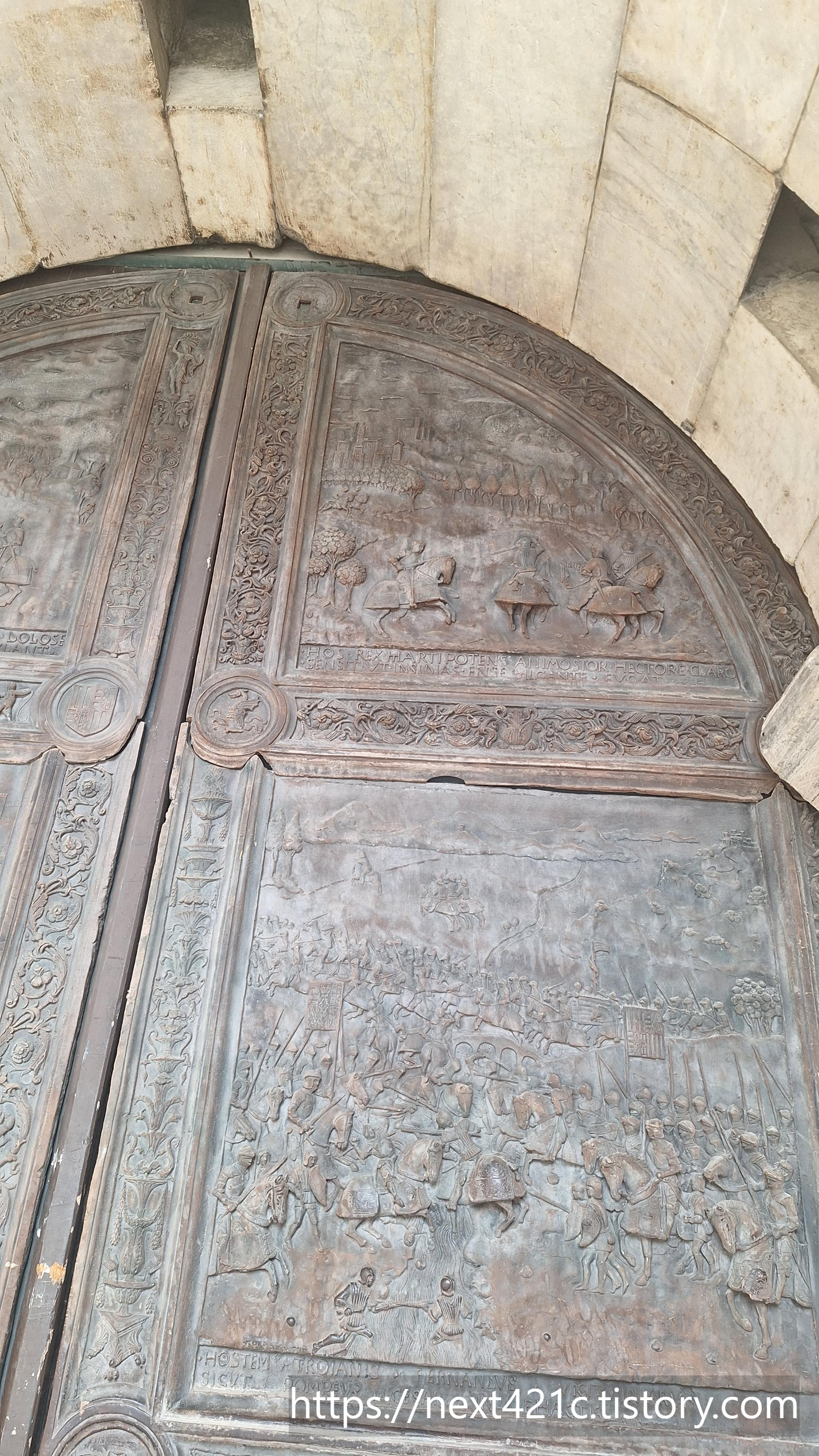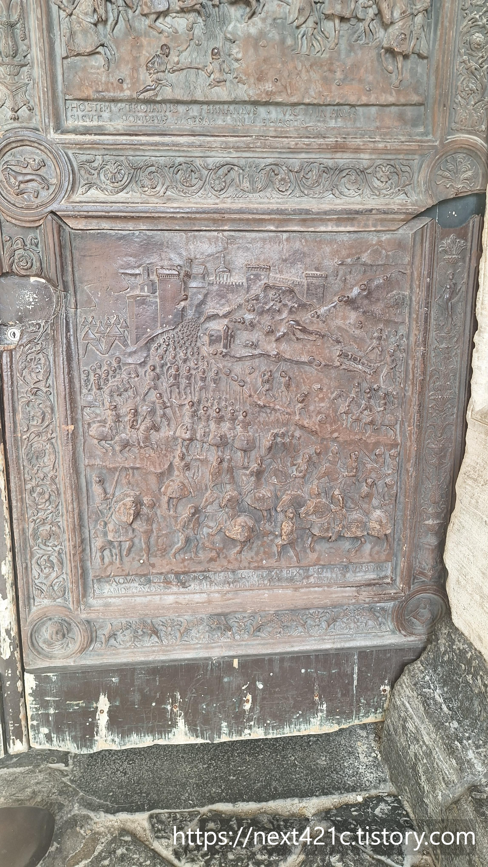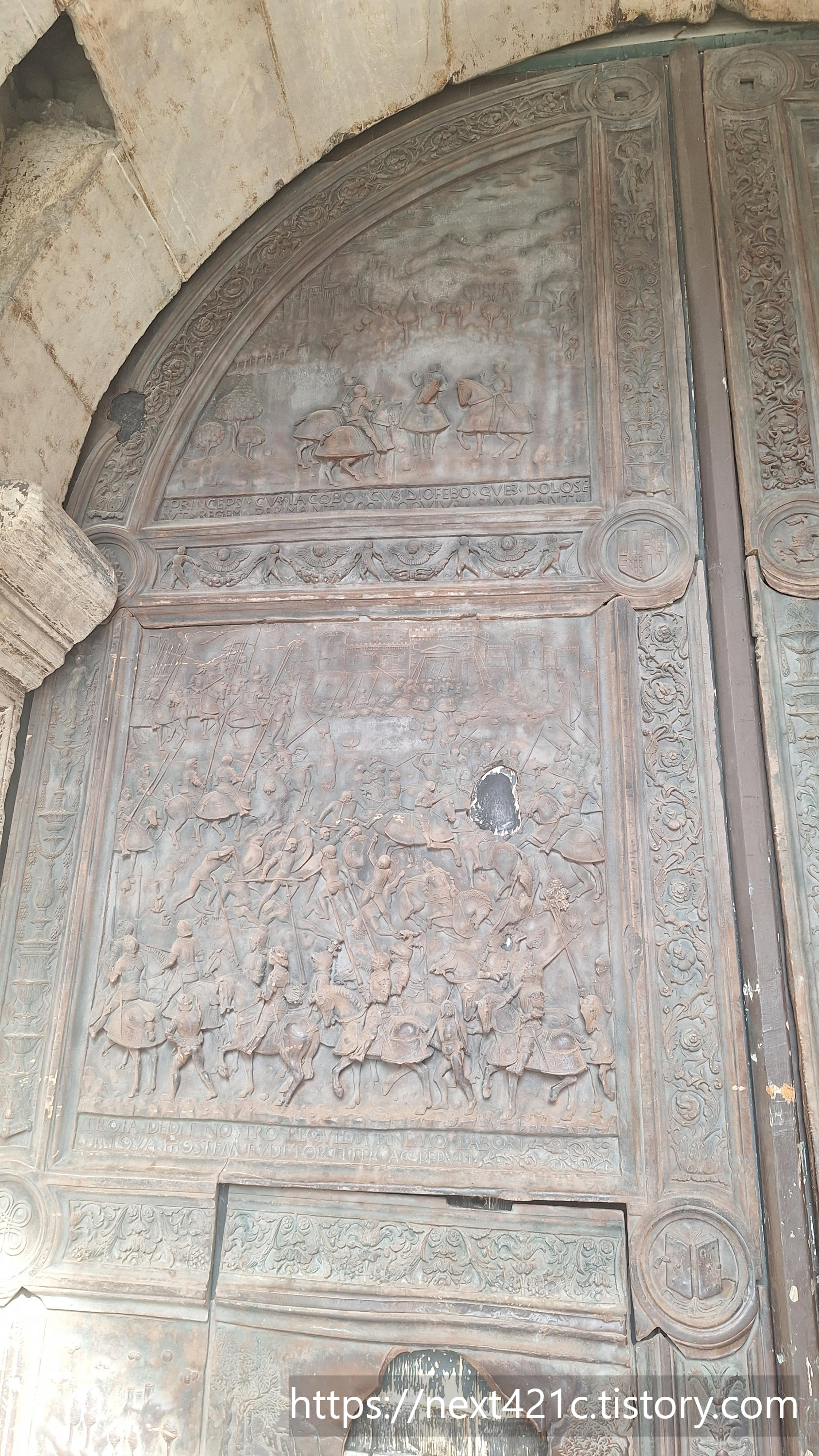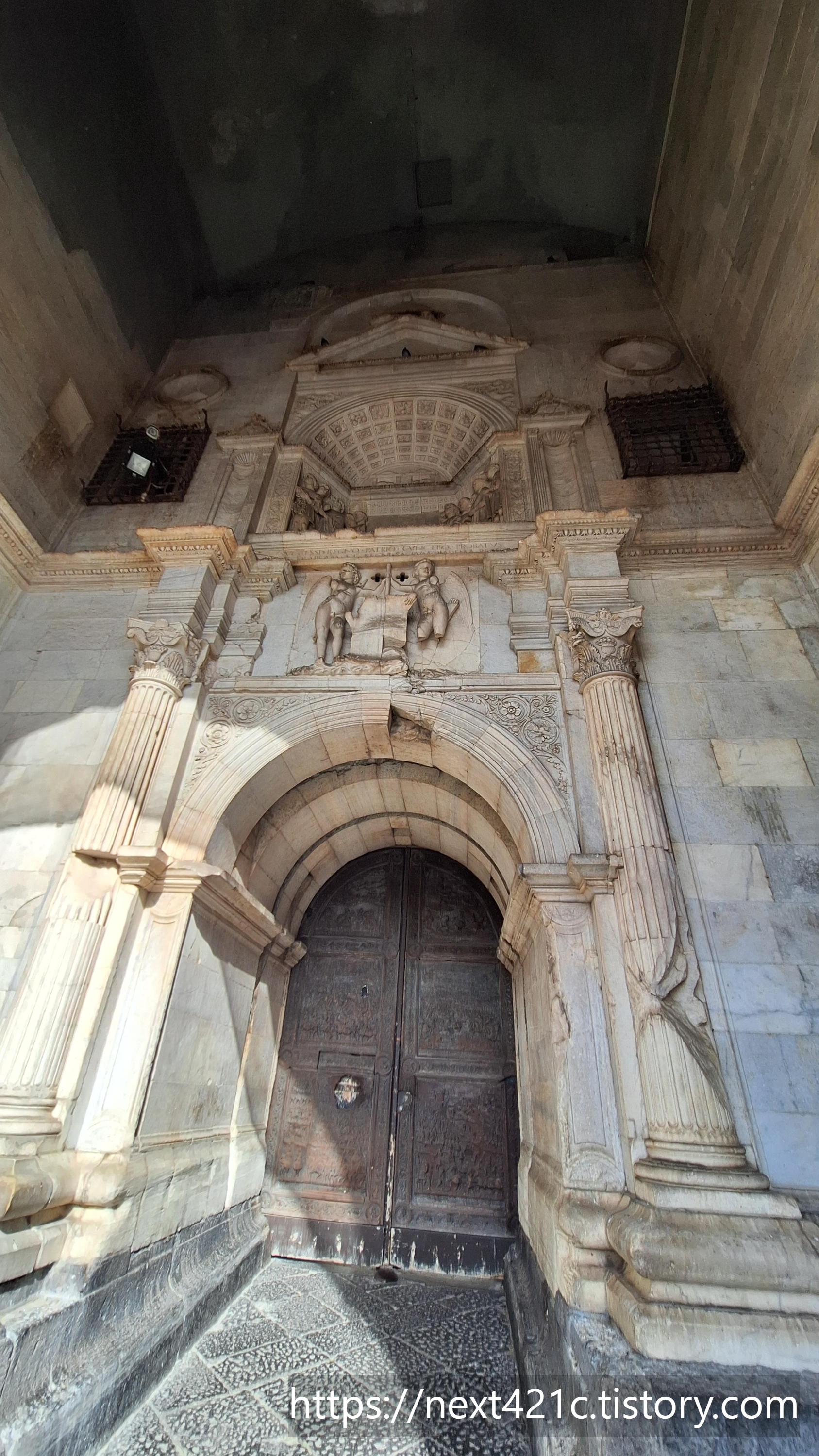 개선문처럼 생긴 입구는 1467년 스페인 아라곤의 알폰소 1세 Alfonso I가 나폴리 입성을 기념하여 나중에 만든 것이라고. 기존 건물과 대단히 이질적이다. 확실히 대비된다.
