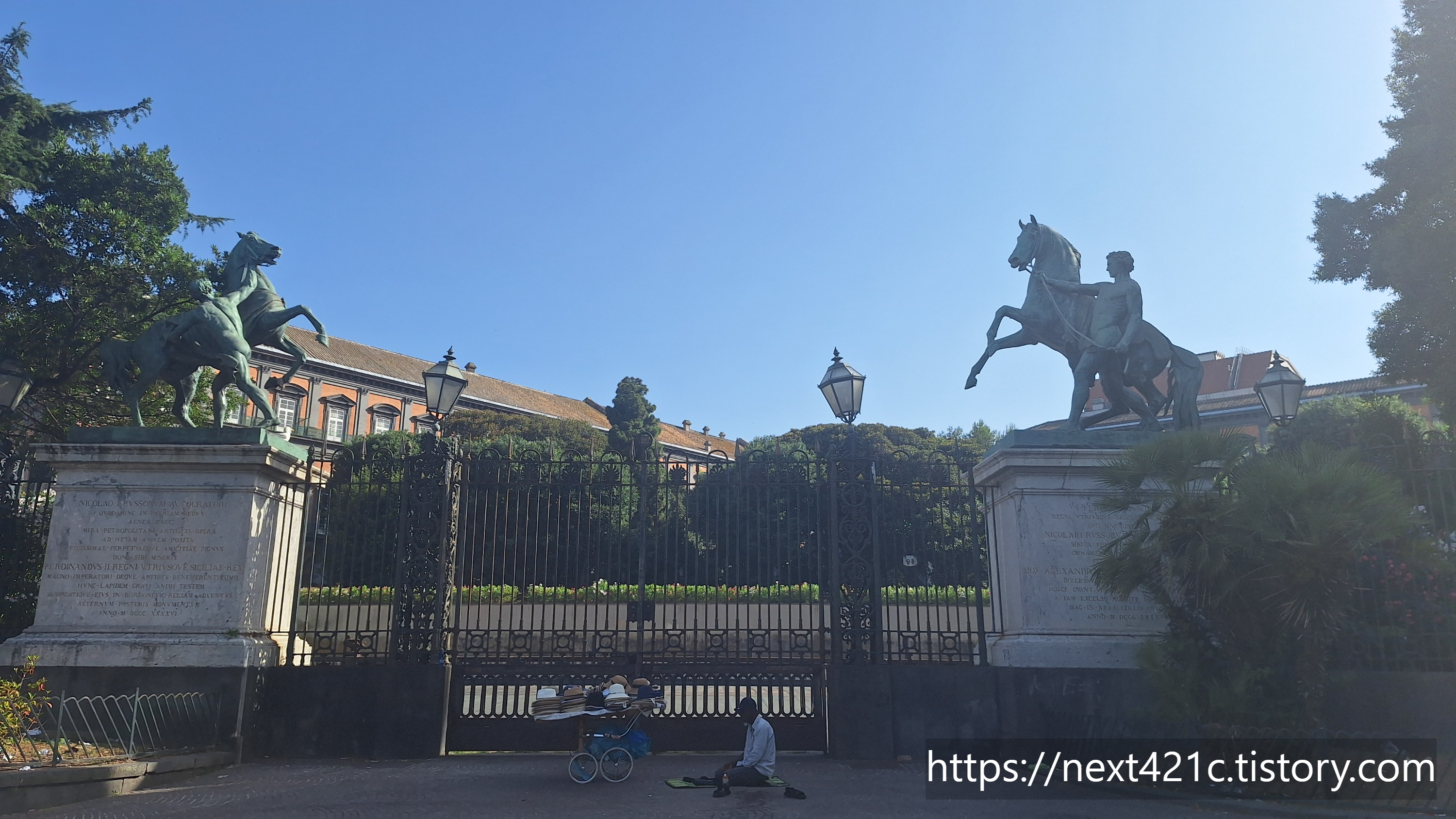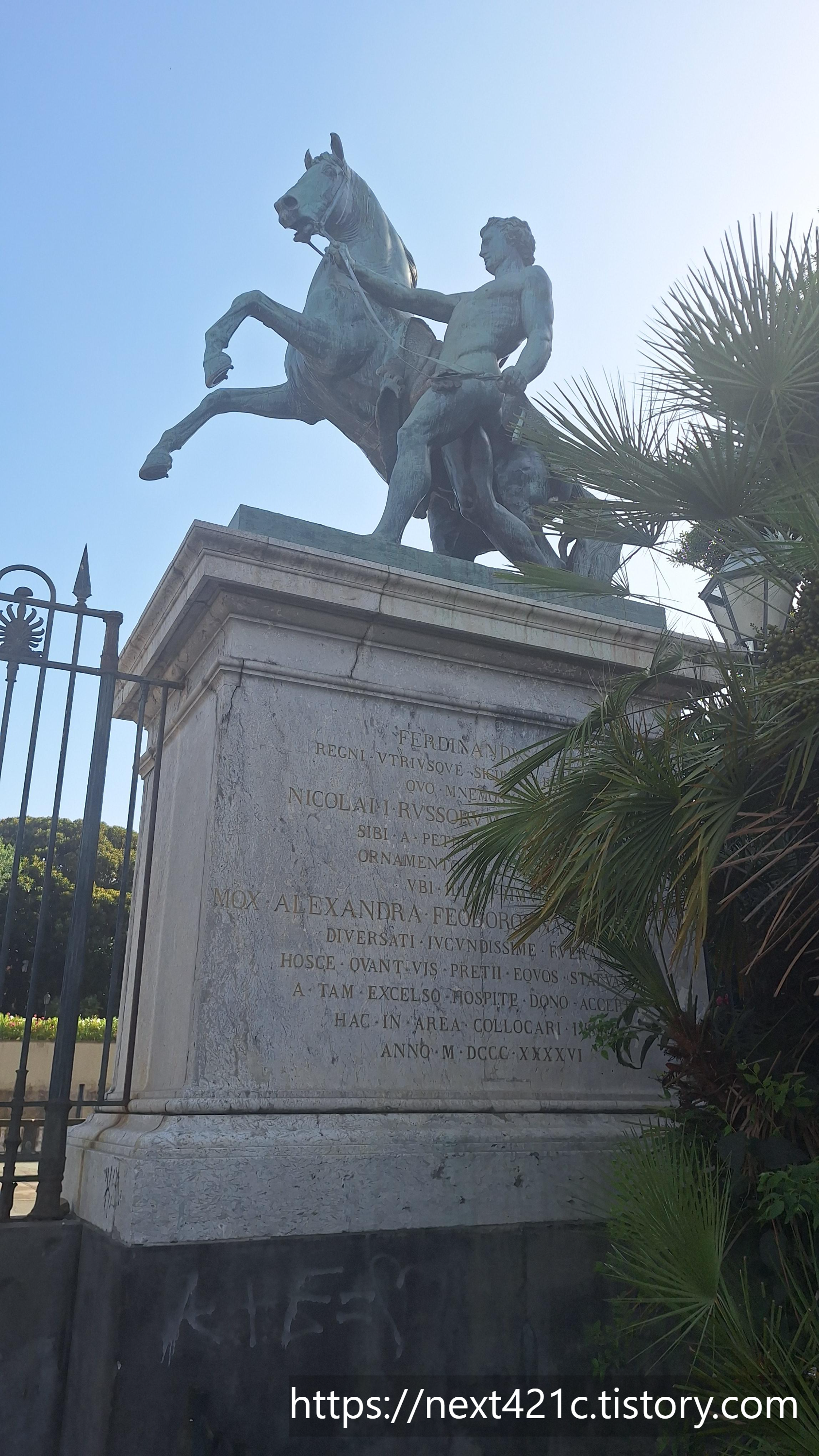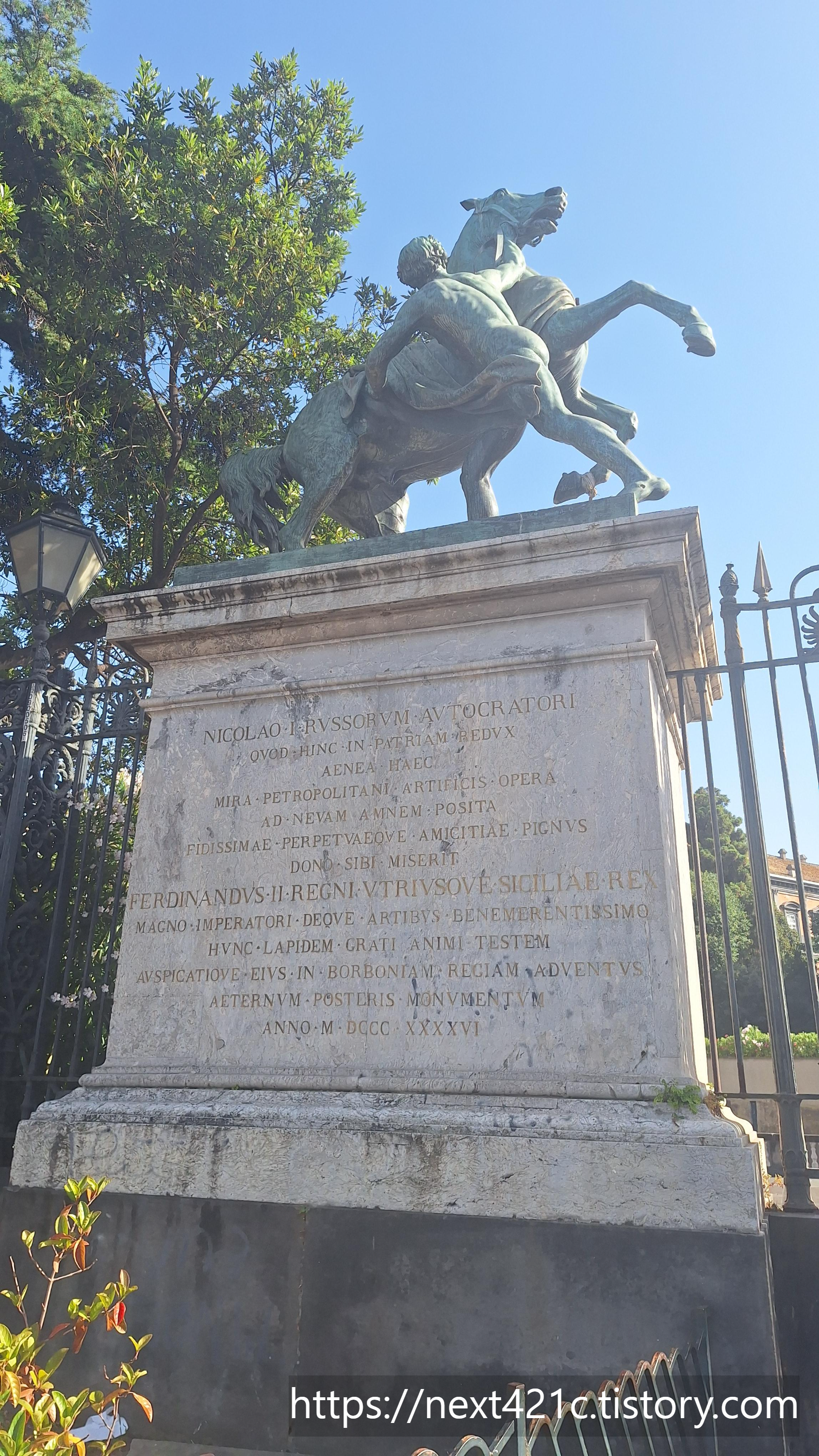나폴리 왕궁 정원의 동쪽 입구 기둥에 세워진 이 두 개의 조각상은 '말 조련사'라는 뜻의 이 도미토리 디 카발리 i domatori di cavalli라고 불린다. 이 조각상들은 러시아 조각가 피터 클로트 폰 위르겐스부르크 Clodt von Jürgensburg(1805~67)의 작품으로 1840년대 초, 클로트 폰 위르겐스부르크가 상트페테르부르크 폰탄카 강에 있는 아니치코프 다리에 놓기 위해 만든 네 개 중 두 개이다.