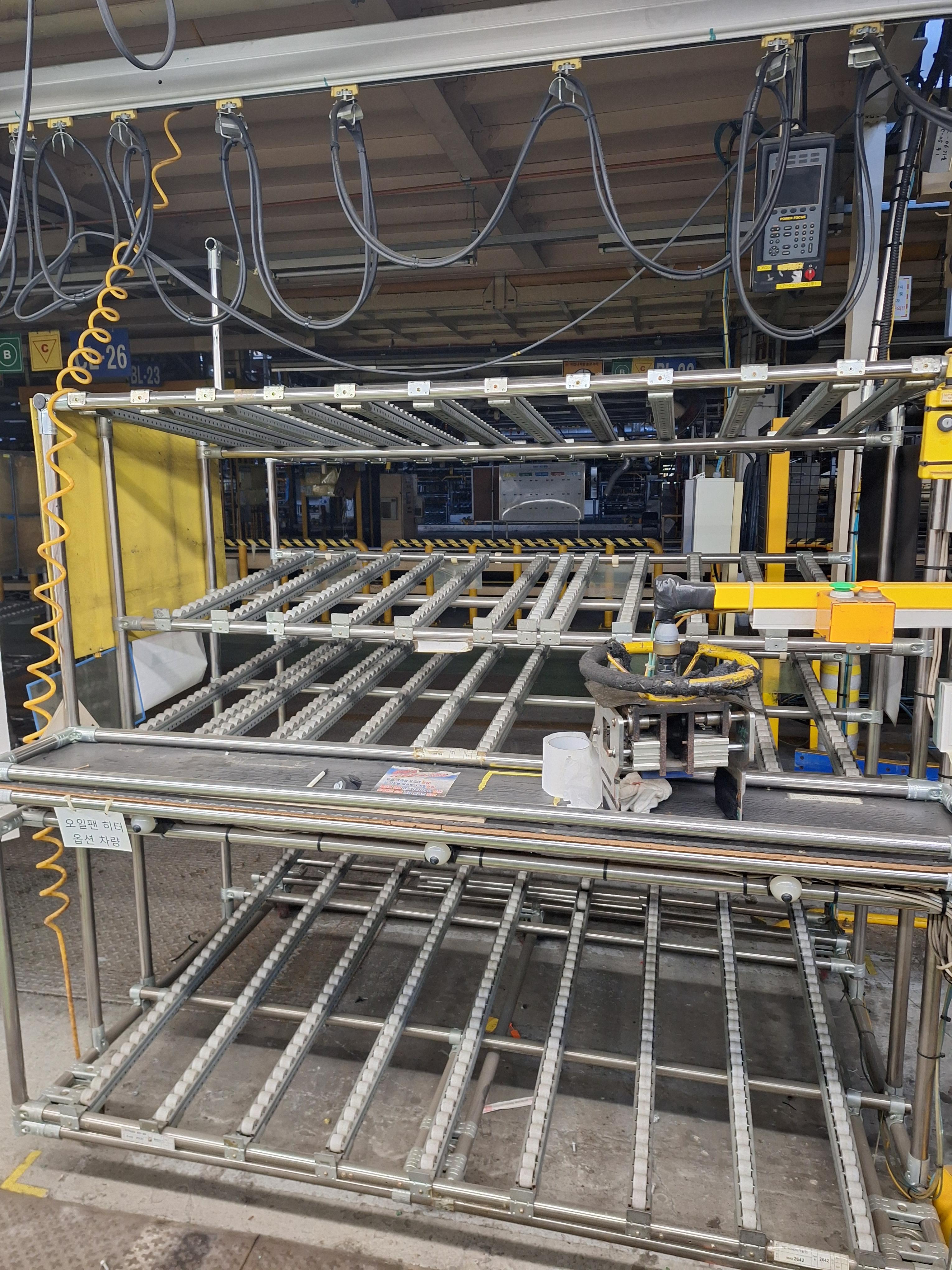 부품 적치대 – 작은 바퀴들이 달려 있어 자연스럽게 미끄러져 내려온다.