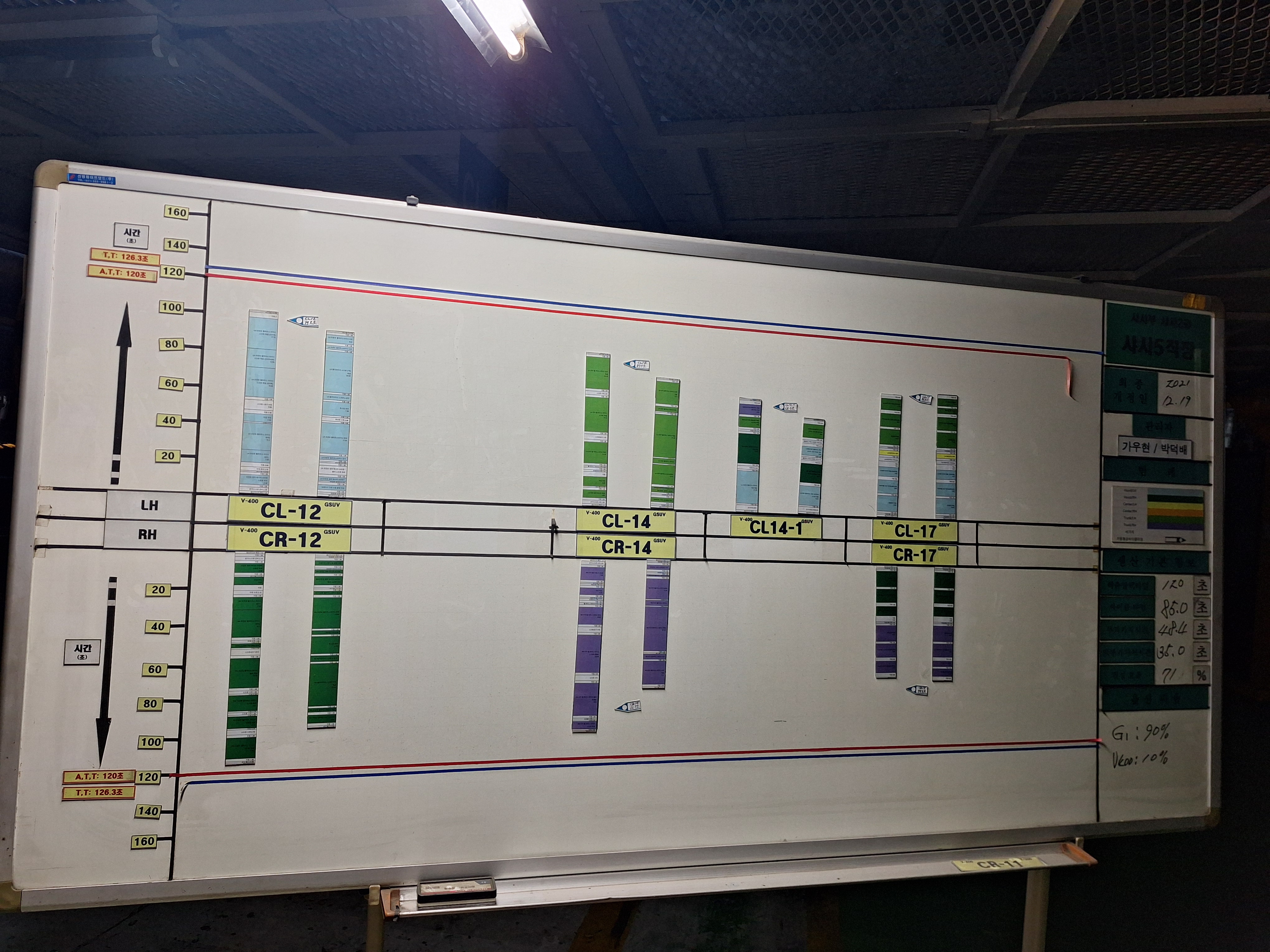 해당 공정의 세부 작업표. 택 타임(tact time) 120초, 시간당 30잡(job). 짧은 시간에 노동자들이 얼마나 많은 작업을 해야 하는지, 그리고 얼마나 많이 반복해야 하는지 시각적으로 잘 보여준다.