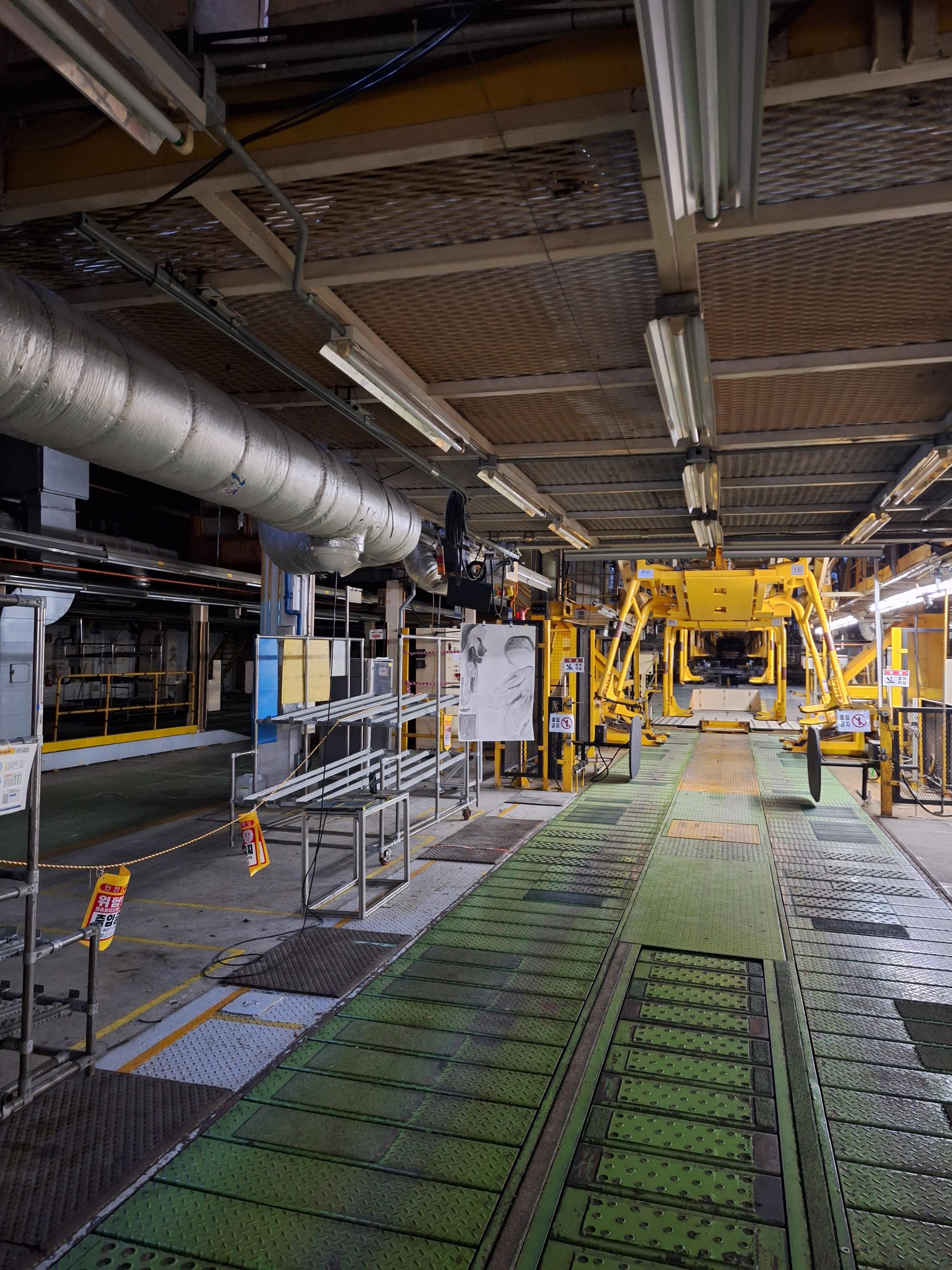 바닥 가운데 녹색 부분이 그 유명한 컨베이어 벨트이고 멀리 보이는 노란색 장치는 행어(hanger) 컨베이어