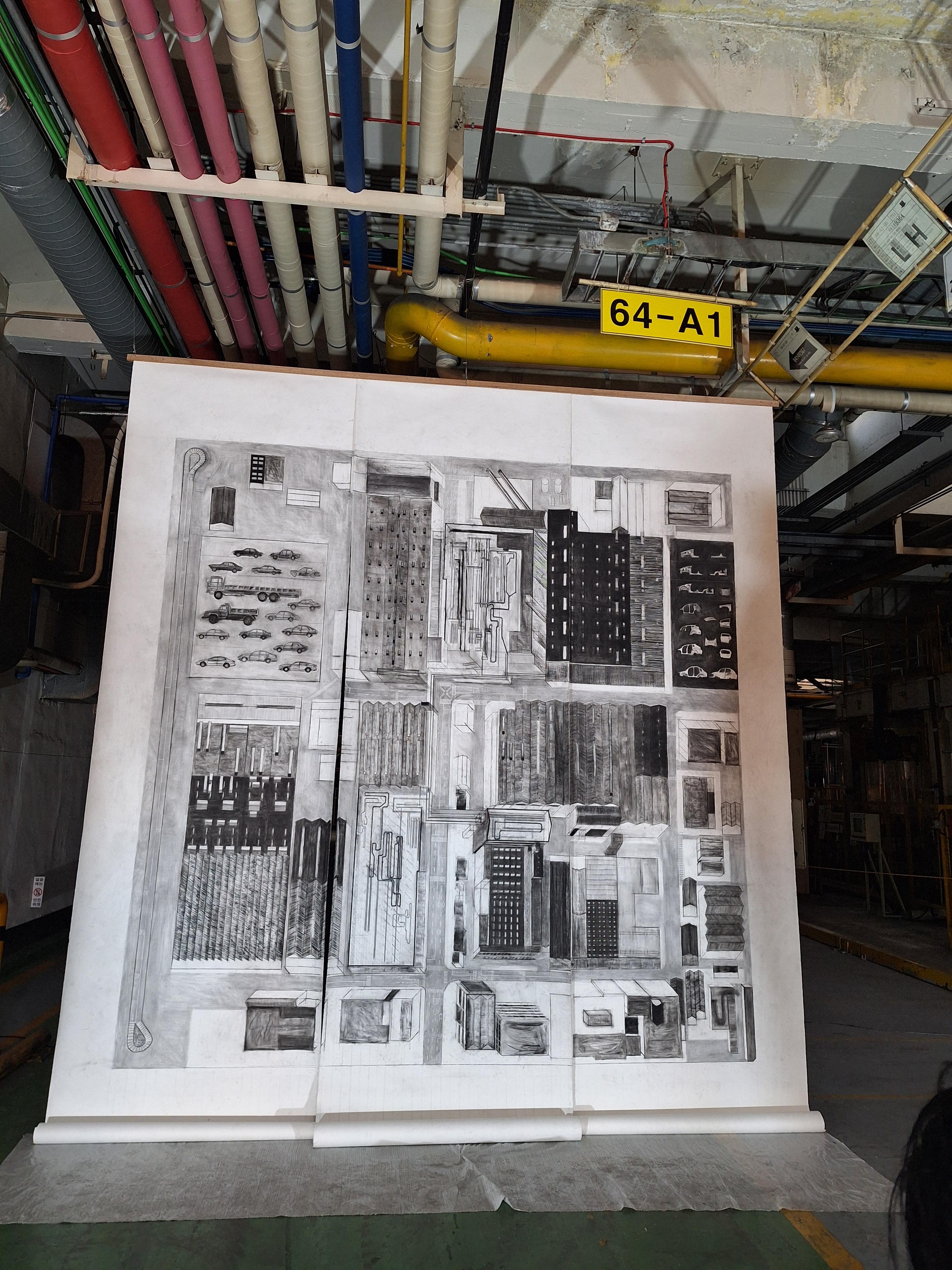 하늘에서 내려다본 공장의 모습과 생산했던 자동차들을 기계가 아니라 손으로 만든 그림.
